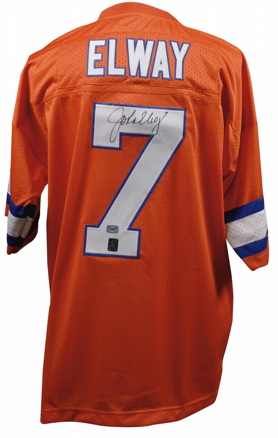 Replica Denver Broncos football jersey, with sewn on letters and numbers, signed in black felt tip on the number on the back. In fine condition.