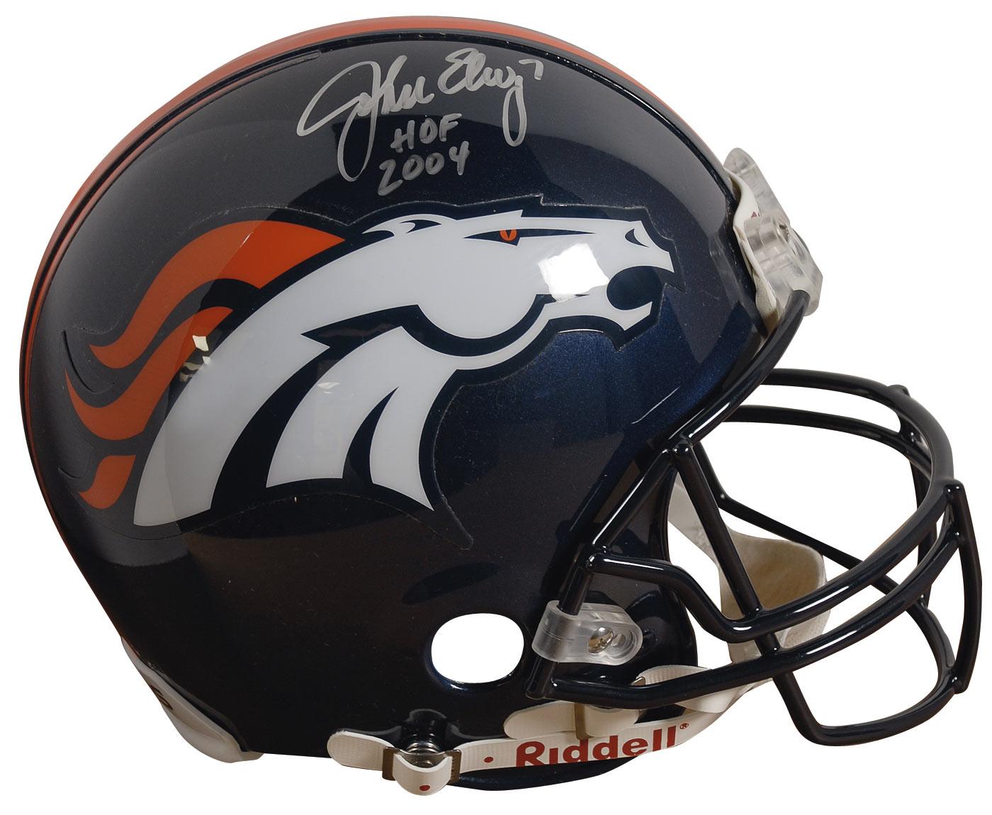 Official Riddell replica Denver Broncos football helmet signed in silver ink, “John Elway 7, HOF 2004.” In very fine condition.