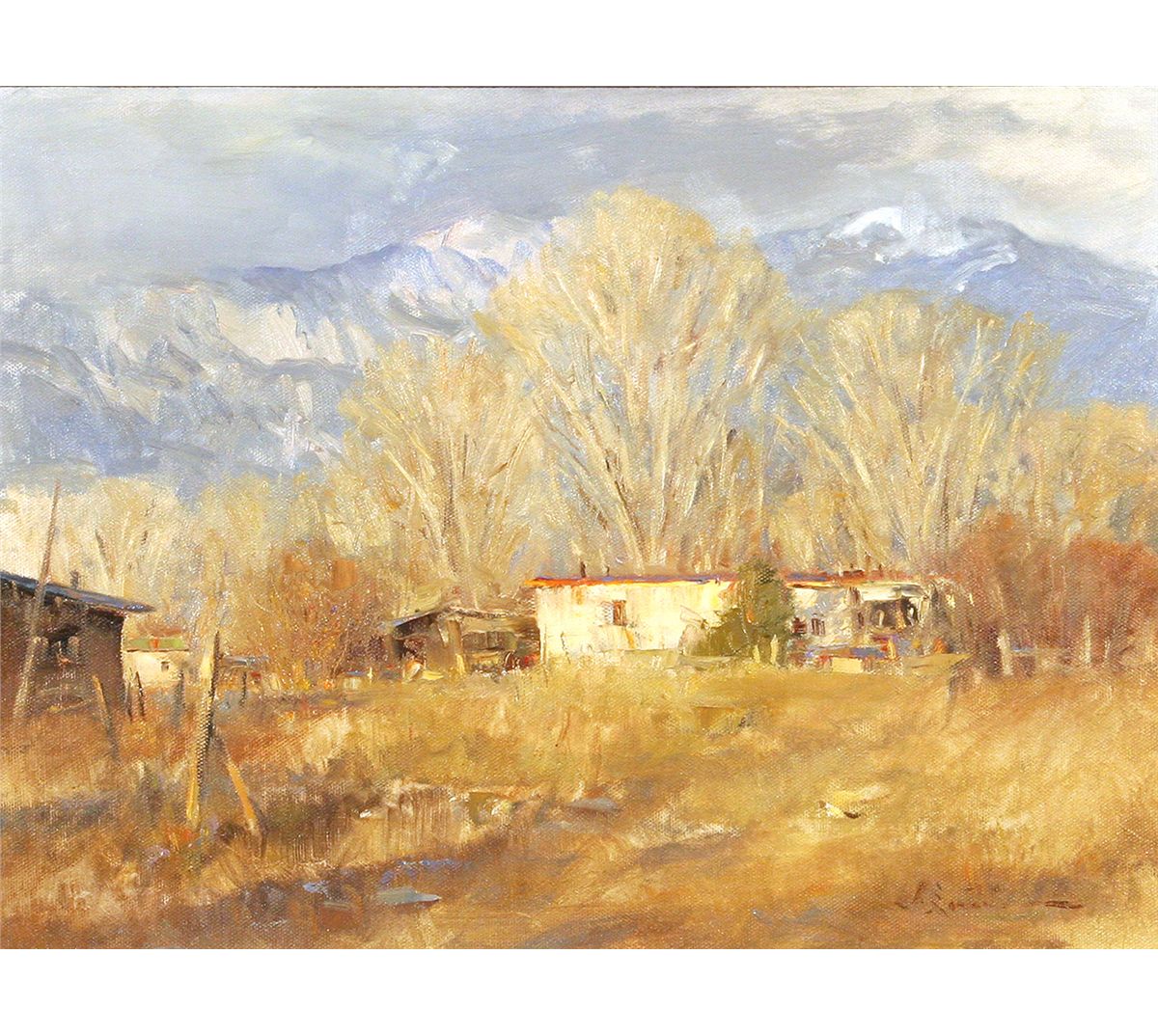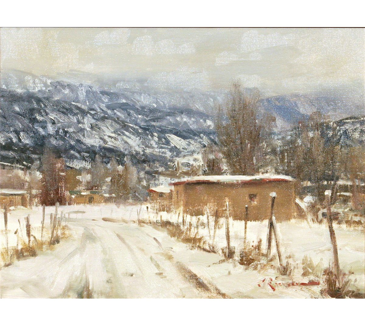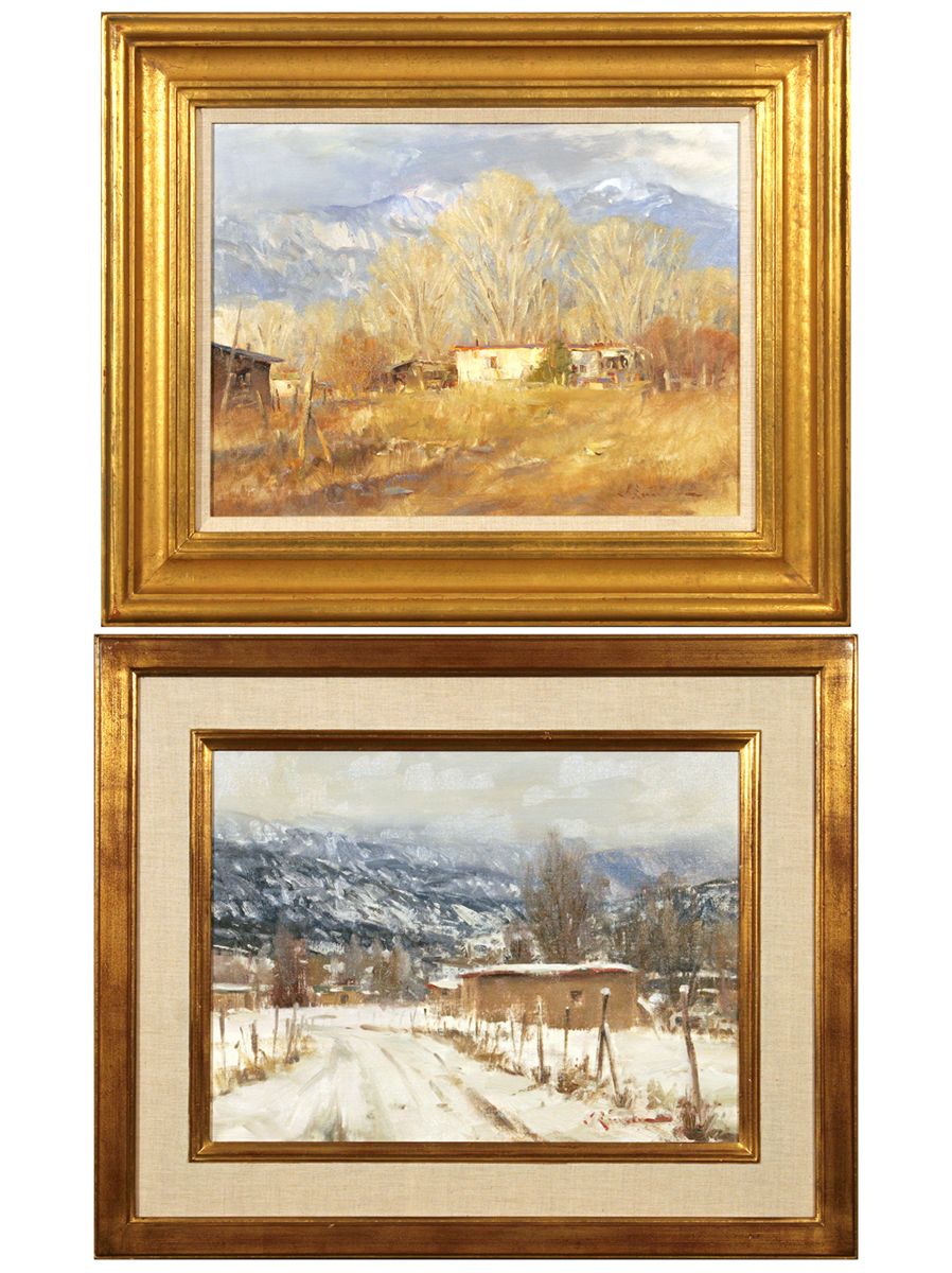 John Encinias (1949 - ). Taos Cottonwoods and Winter Day. Both 12" x 16" oils on canvas. Each signed lower right: J. Encinias. Each is signed, titled and dated 1993 verso.