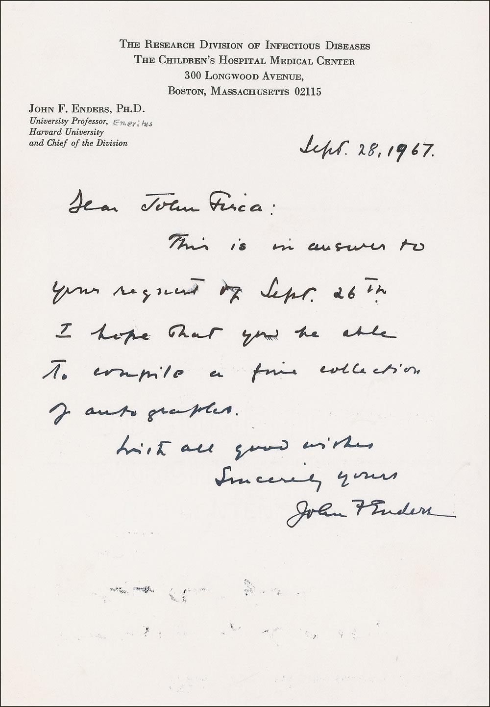 Virologist (1897-1985) who received the 1954 Nobel Prize in physiology. ALS, one page, 6.25 x 9, Research Division of Infectious Diseases letterhead, September 28, 1967. Brief letter to an autograph request. In full: “This is in answer to your request of Sept. 26th. I hope that you [will] be able to compile a fine collection of autographs.” In fine condition, with a couple slight brushes to text, and mirroring of text along bottom blank area of page.