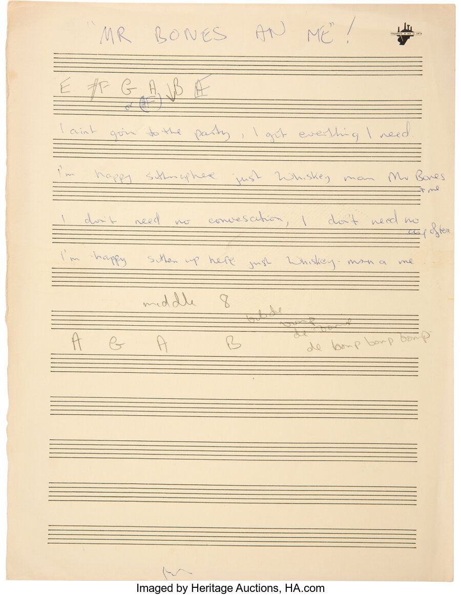 John Entwistle Handwritten Partial Lyrics to "Ten Little Friends"Handwritten partial lyrics to Entwistle song "Ten Little Friends," the lead track on his album Whistle Rymes, inspired by a collection of troll figures given to him by Keith Moon. In this early rendition, Entwistle titles the song "Mr Bones an Me!" with lyrics differing slightly from the recorded version. Uncorrected lyrics read, "I aint goin to the party, I got everything I need / I'm happy sittin up here just Whiskey, man Mr Bones me / I don't need no convesation, I don't need no cup of tea / I'm happy sitten up here just Whiskey man a me."