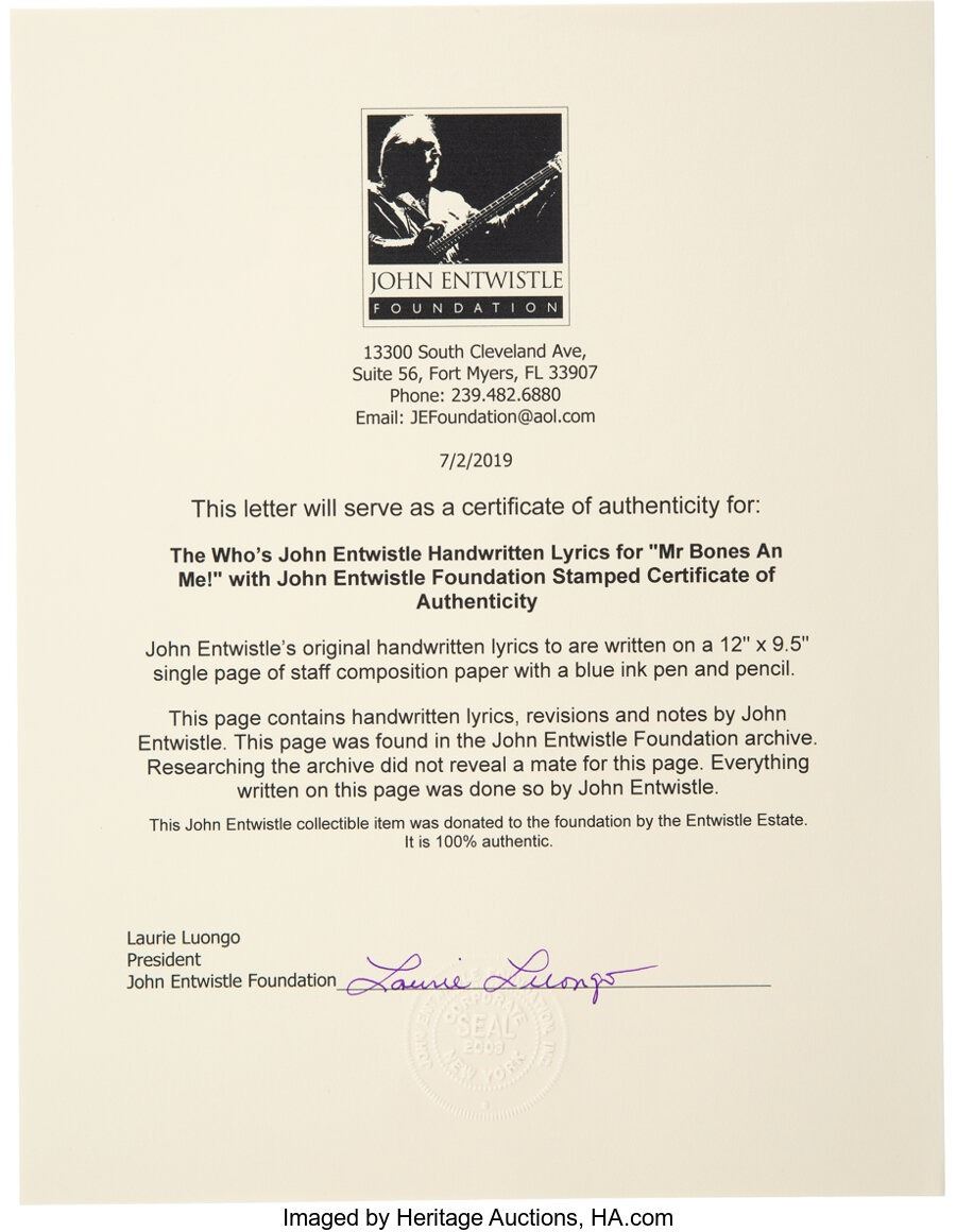 Entwistle also writes chords for the song at the top and bottom of the page, which measures 9.5" x 12". In Very Good condition with toning on the page, left edge is rough, and there are a few soil spots. COAs from the John Entwistle Foundation and Heritage Auctions.