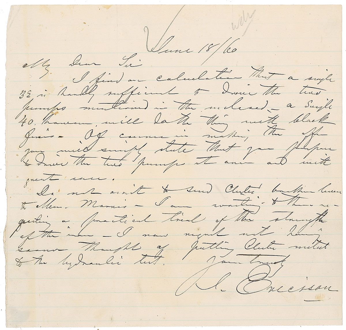 Swedish-American Army engineer (1803–1889) who designed and built the ironclad warship Monitor for the American Navy. ALS signed “J. Ericsson,” one page, 7.75 x 9.75, September 18, 1860. Letter to a gentleman. In part: “I find on calculation that a single 32 is hardly sufficient to drive the two pumps mentioned…in making the offer you will simply state that you propose to drive the two pumps at once and with great care.” Intersecting folds (one passing through a single letter of the signature), scattered soiling, and a few pencil notations to the top, otherwise fine condition.