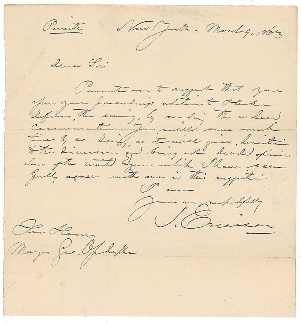 Swedish-American Army engineer (1803–1889) who designed and built the ironclad warship Monitor for the American Navy. Civil War–dated ALS signed “J. Ericsson,” one page, 7.75 x 8.25, March 9, 1863. Letter to George Opdyke, the mayor of New York. In part: “Permit me to suggest that you open your proceedings relative to Harbor defenses, this evening, by reading the enclosed communication. You will save much time by doing so, as it will give direction to the discussions and bring out decided opinions.” A crease to the upper left and mild overall creases, otherwise fine condition.
