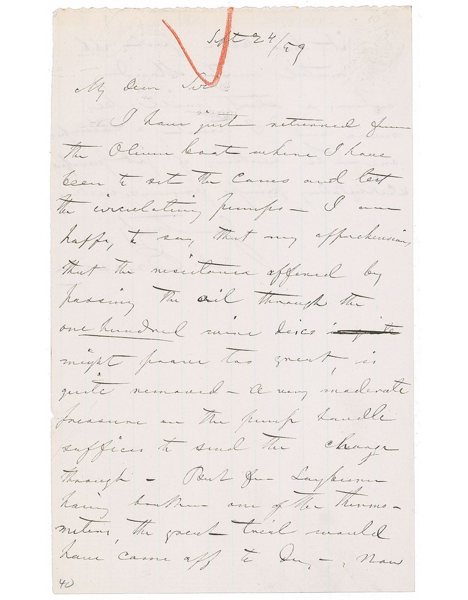 Swedish-American Army engineer (1803–1889) who designed and built the ironclad warship Monitor for the American Navy. ALS signed “J. Ericsson,” one page both sides, 5 x 8, September 24, 1859. Letter to an unidentified recipient. In full: “I have just returned from the Oliver boat where I have been to set the canes and test the circulating pumps—I am happy to say that my apprehension that the resistance offered by the passing through one hundred wire discs might prove too great, is quite removed—A very moderate pressure in the pump handle suffices to send the charge through—But for Layburn having broken one of the thermometers, the great trial would have come off today—Now it has been put off until next Monday when a start will be made and, I trust, a successful one—The new thing of jet pumps & circulating pumps promise well.” In fine condition.