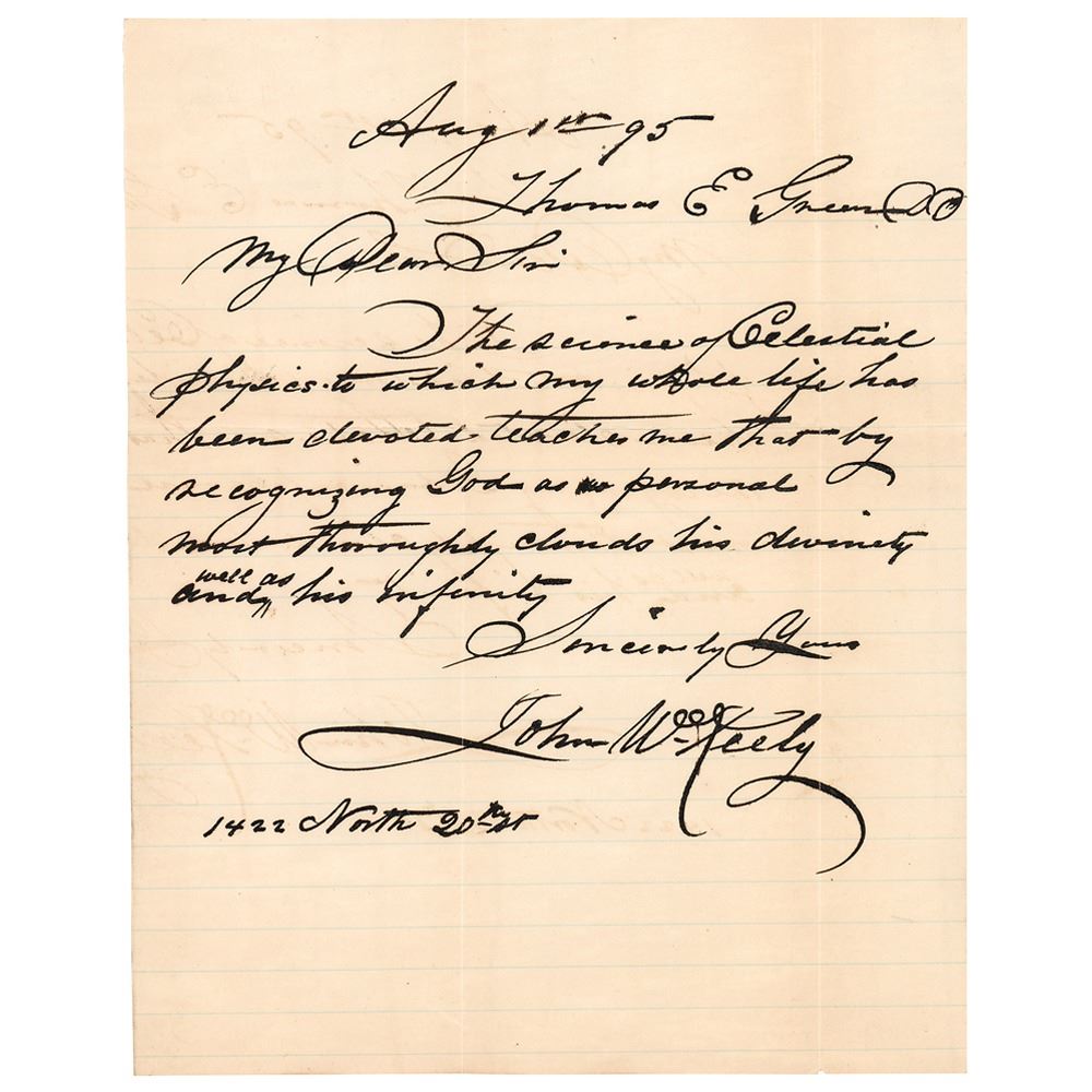 Fraudulent American inventor from Philadelphia (1837–1898) who claimed to have discovered a new motive power which was originally described as ‘vaporic’ or ‘etheric force, and later as an unnamed force based on ‘vibratory sympathy,’ by which he produced ‘interatomic ether’ from water and air. Despite numerous requests from the stockholders of the Keely Motor Company, which had been established to produce a practicable motor based on his work, he consistently refused to reveal to them the principles on which his motor operated, and also repeatedly refused demands to produce a marketable product by claiming that he needed to perform more experiments. Scarce ALS signed “John W. Keely,” one page, 7.75 x 9.75, August 1, 1895. Handwritten letter to Thomas E. Green, in full: "The science of Celestial physics to which my whole life has been devoted teaches me that by recognizing God as personal most thoroughly clouds his divinity and well as his infinity." In fine condition. Accompanied by the original mailing envelope, addressed in Keely's own hand.