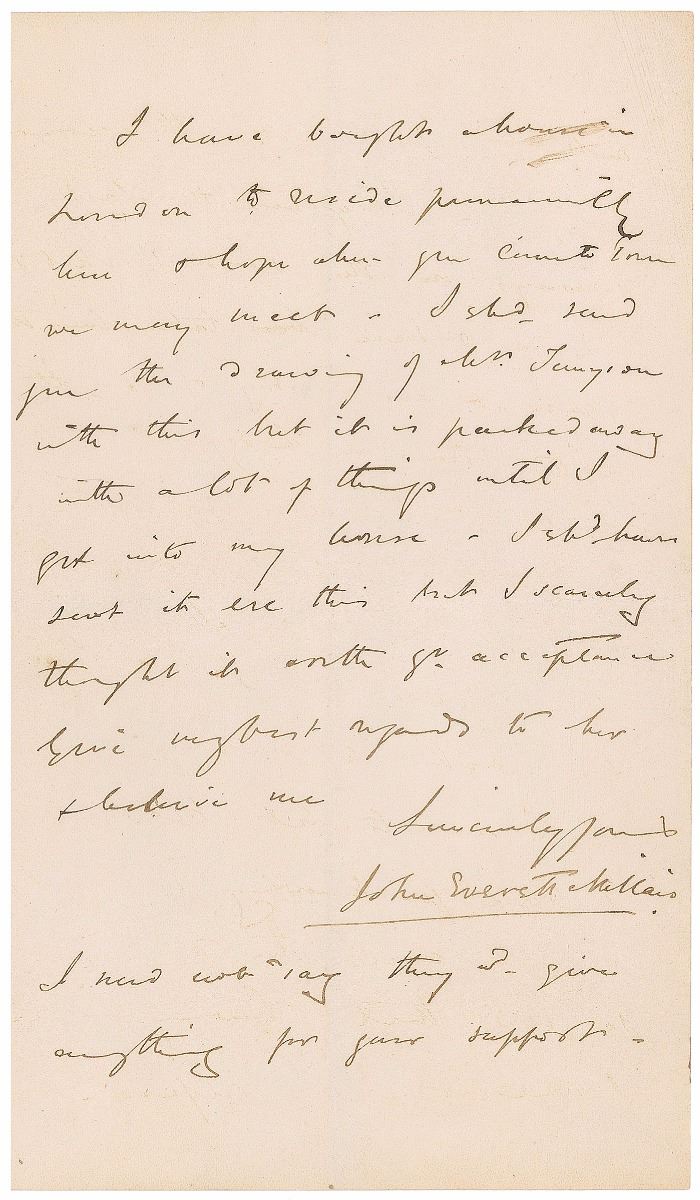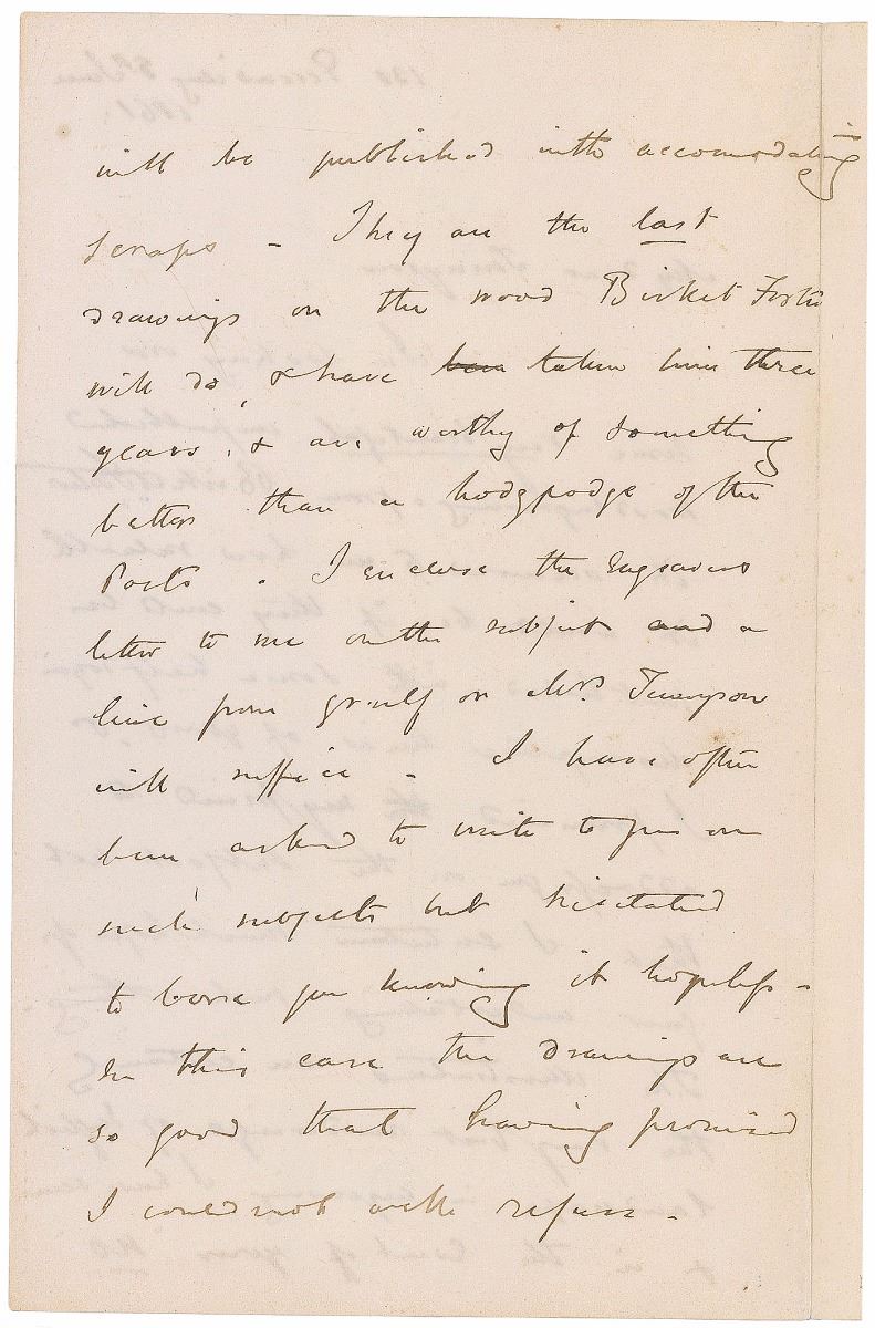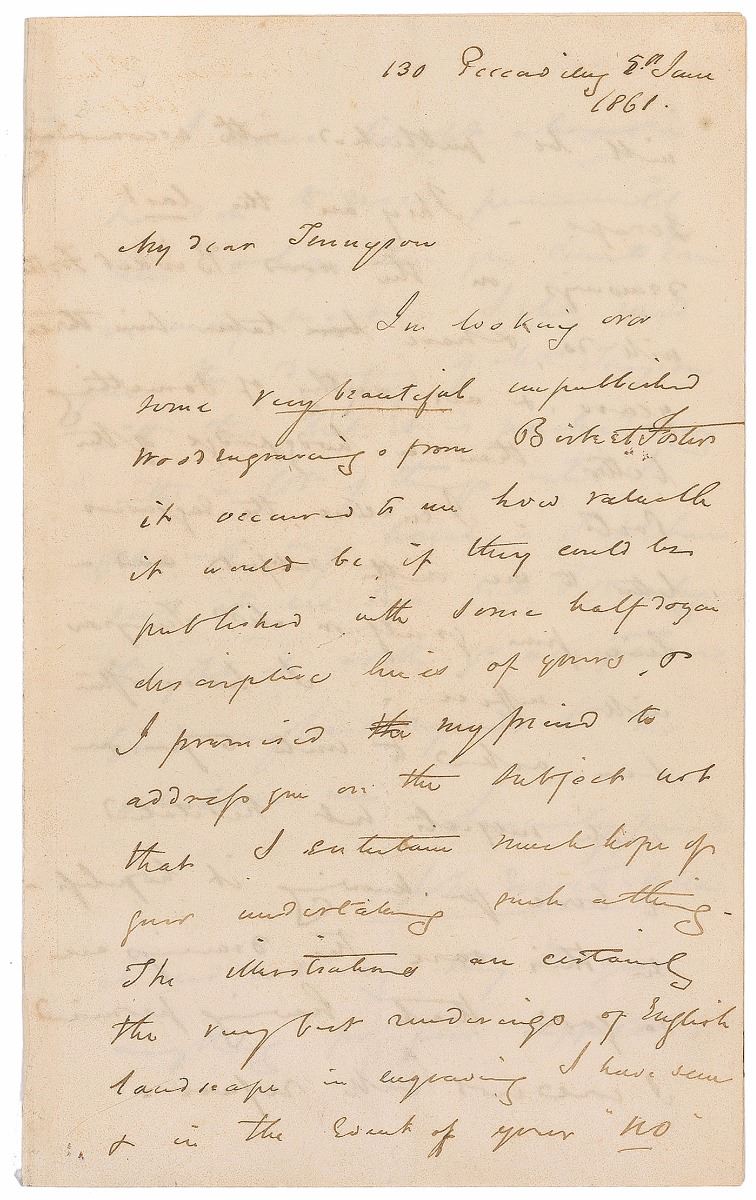 Noted English painter and illustrator (1829–1896). ALS, three pages on two adjoining sheets, 4.5 x 7, June 5, 1861. Letter to Alfred Lord Tennyson. In part: “In looking over some very beautiful unpublished wood engravings from Birket Foster it occurred to me how valuable it would be if they could be published with some half dozen descriptive lines of yours…The illustrations are certainly the very best rendering of English landscape in engraving I have seen…worthy of something better than a hodgepodge of poets…I should have sent you the drawings of Mrs. Tennyson.” In fine condition, with central horizontal and vertical folds, and a small separation to hinge. Tennyson declined and Tom Taylor wrote the text for Myles Birket Foster’s distinguished publication entitled Pictures of English Landscape in 1863. The book was bound in an elaborate casing by Owen Jones and presented to the public as a gift-book to be enjoyed by the fireside over the festive season. A fantastic letter connecting these several prominent 19th–century British artists.