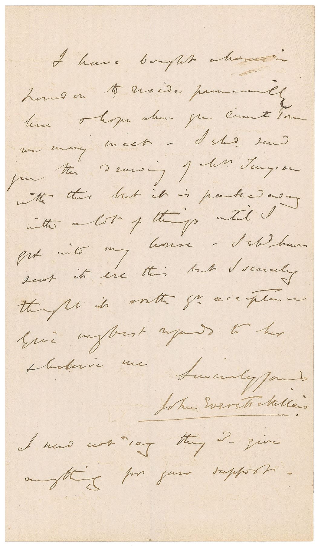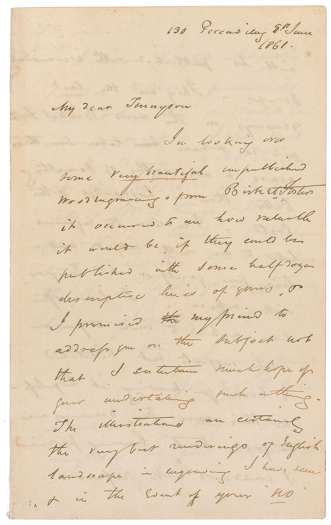 Noted English painter and illustrator (1829–1896) who was one of the founders of the Pre-Raphaelite Brotherhood. ALS, three pages on two adjoining sheets, 4.5 x 7, June 5, 1861. Letter to Alfred, Lord Tennyson. In part: "In looking over some very beautiful unpublished wood engravings from Birket Foster it occurred to me how valuable it would be if they could be published with some half dozen descriptive lines of yours…The illustrations are certainly the very best rendering of English landscape in engraving I have seen…worthy of something better than a hodgepodge of poets…I should have sent you the drawings of Mrs. Tennyson." In fine condition, with central horizontal and vertical folds, and a small separation to hinge. Tennyson declined and Tom Taylor wrote the text for Myles Birket Foster's distinguished publication entitled Pictures of English Landscape in 1863. The book was bound in an elaborate casing by Owen Jones and presented to the public as a gift-book to be enjoyed by the fireside over the festive season. A fantastic letter connecting these several prominent 19th-century British artists.