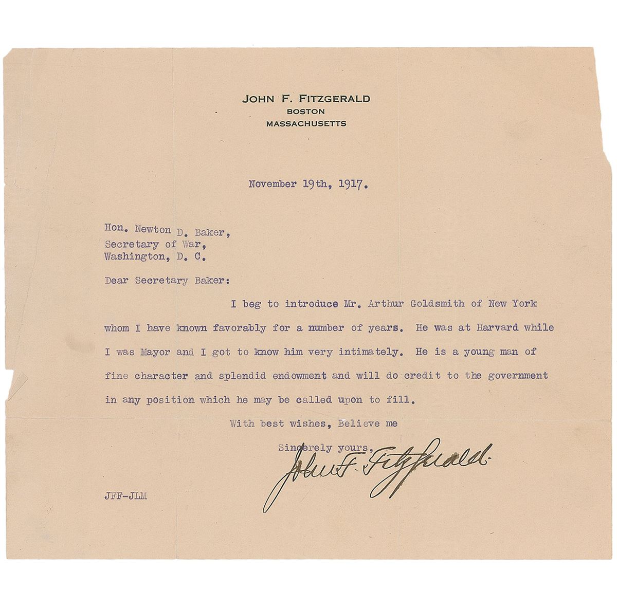 Democratic mayor of Boston, father of Rose Kennedy, and namesake of his grandson John F. Kennedy (1863–1950). TLS signed “John F. Fitzgerald,” one page, 8.5 x 7.25, personal letterhead, November 19, 1917. Letter to Secretary of War Newton D. Baker. In full: “I beg to introduce Mr. Arthur Goldsmith of New York whom I have known favorably for a number of years. He was at Harvard while I was Mayor and I got to know him very intimately. He is a young man of fine character and splendid endowment and will do credit to the government in any position which he may be called upon to fill.” In very good condition, with intersecting folds (one vertical fold passing through a single letter of the signature), partial edge separations at folds, a thin area of paper loss to the upper right edge, and a few tape-repaired tears. Goldsmith was the friend and Harvard classmate of Fitzgerald’s son-in-law, Joseph P. Kennedy. He went on to become a Wall Street stockbroker and maintained a close relationship with the Kennedy family.