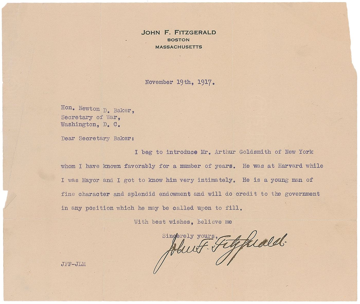 Democratic mayor of Boston nicknamed 'Honey Fitz,' father of Rose Kennedy, and namesake of his grandson John F. Kennedy (1863–1950). TLS signed "John F. Fitzgerald," one page, 8.5 x 7.25, personal letterhead, November 19, 1917. Letter to Secretary of War Newton D. Baker. In full: "I beg to introduce Mr. Arthur Goldsmith of New York whom I have known favorably for a number of years. He was at Harvard while I was Mayor and I got to know him very intimately. He is a young man of fine character and splendid endowment and will do credit to the government in any position which he may be called upon to fill." In very good condition, with splitting along folds, and a few tears. Goldsmith was the friend and Harvard classmate of Fitzgerald's son-in-law, Joseph P. Kennedy. He went on to become a Wall Street stockbroker and maintained a close relationship with the Kennedy family.