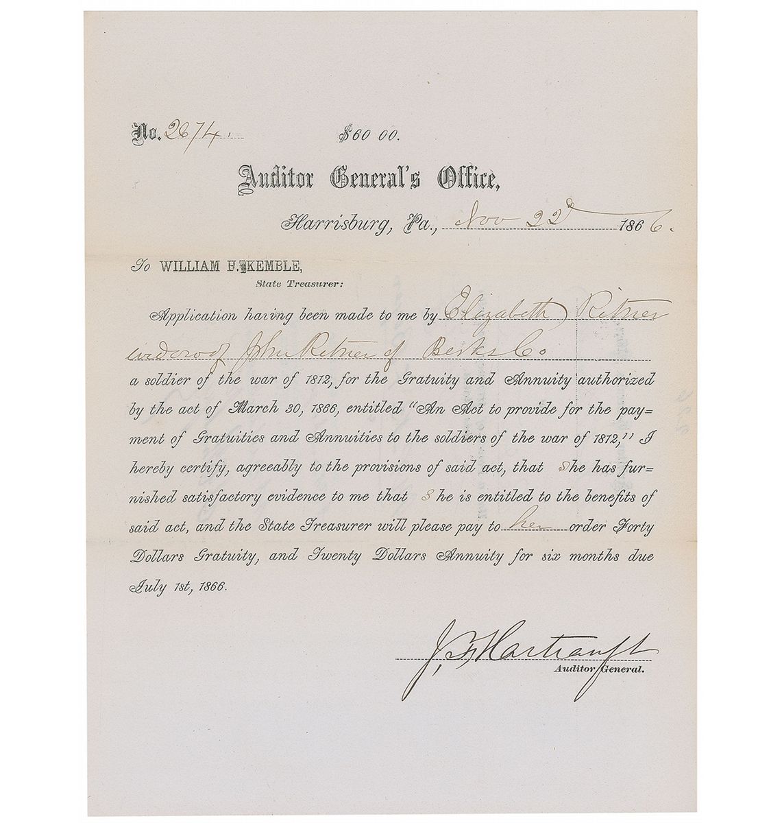 Union general (1830–1889) awarded the Medal of Honor for his participation in the First Battle of Bull Run; he later served as a a special provost marshal during the trial of the Lincoln assassination conspirators, and led the convicted Mary Surratt, Lewis Paine, David Herold, and George Atzerodt to the gallows, where he read them their last rites before they were hanged. Partly-printed DS, signed “J. F. Hartranft,” one page, 7.5 x 9.75, November 22, 1866. As auditor general, Hartranft confirms the eligibility of a veteran’s widow for a pension. In part: “Application having been made to me by Elizabeth Ritner, widow of John Ritner of Berks Co, a soldier of the war of 1812, for the Gratuity and Annuity authorized…I hereby certify…that she is entitled to the benefits.” In fine condition, with expected document wear.