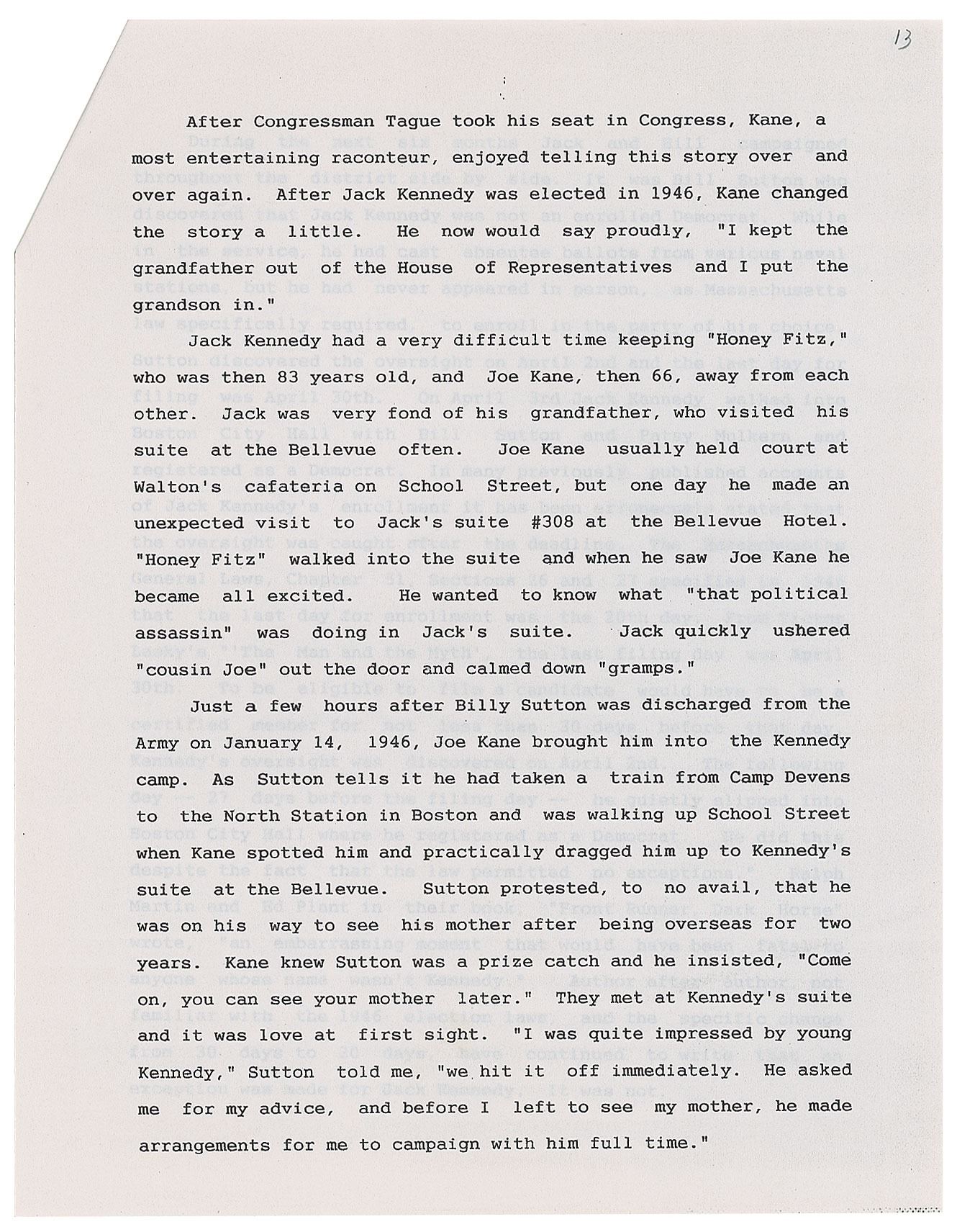 5 page recap of 1946 campaign by Dave Powers unique and probably unpublished as no one else had such unfettered closeness to JFK with such first hand knowledge of this campaign.