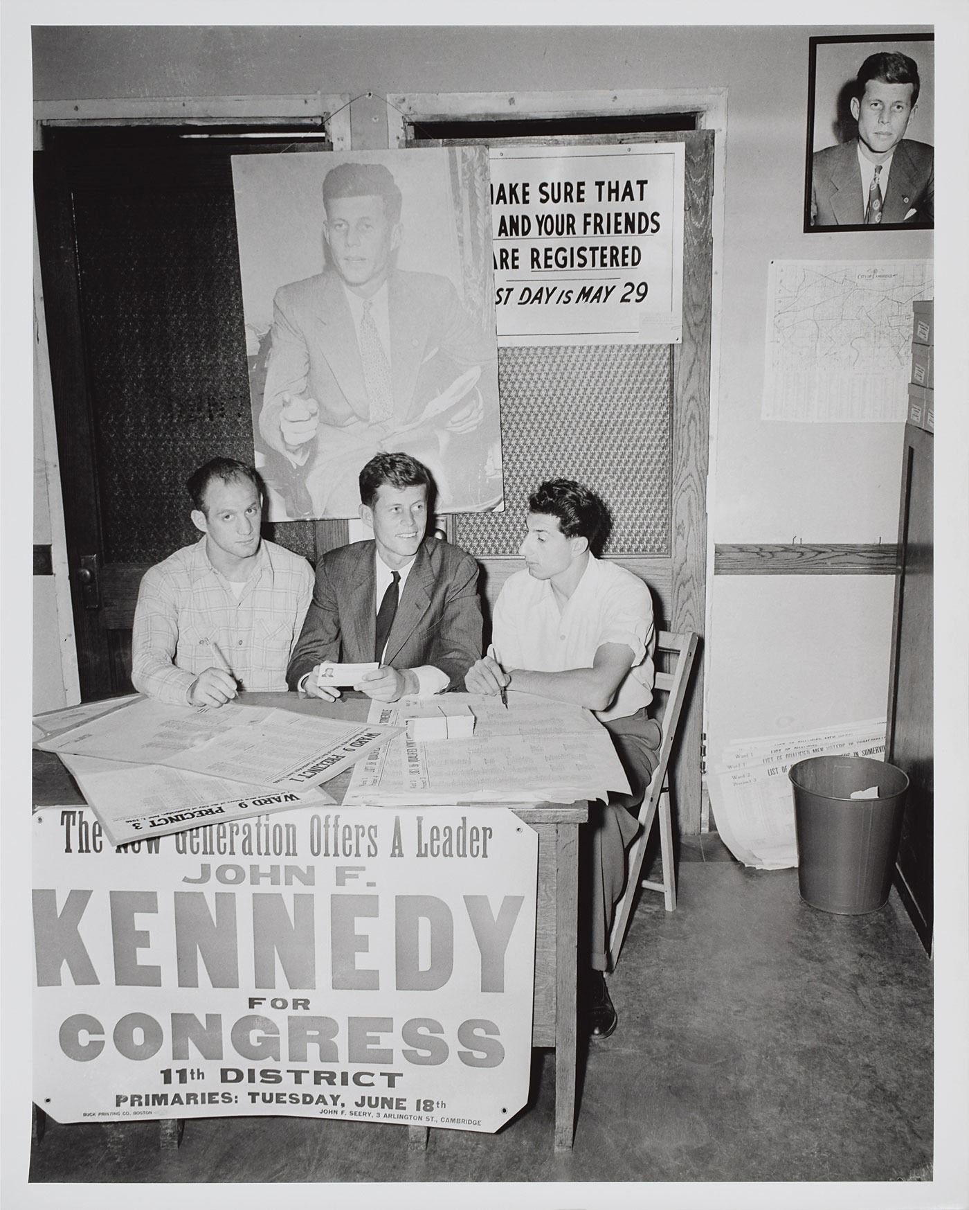 Rare first generation 20” x 24” silver gelatin photograph printed from the original 4” x 5” negative, showing John F. Kennedy posing with two campaign workers, a banner below them reading: "The New Generation Offers a Leader, John F. Kennedy for Congress, 11th District." This image was used as an 'official' portrait photograph during Kennedy's 1946 congressional campaign. In very fine museum-quality condition. The 'New Generation' slogan was created by Joe Kane, an old-school politician and Kennedy cousin. A ‘grassroots' portrait photograph of Kennedy at work.