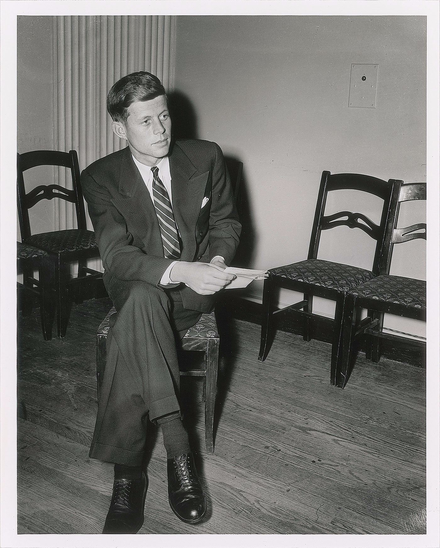 Scarce first generation 8” x 10” silver gelatin photograph printed from the original 4” x 5” negative, showing John F. Kennedy practicing his sitting posture during a photo session at his Beacon Hill apartment in 1948. This image was later used as an 'official' publicity portrait in JFK’s 1952 Senatorial campaign. In very fine museum-quality condition. In 1948 JFK began taking 'speaking lessons' from legendary Hollywood executive Joe Schenck and used his Beacon Hill apartment as a backdrop for some of these lessons.