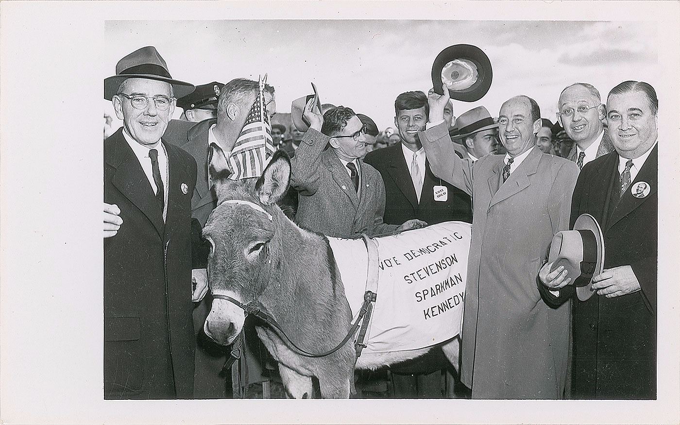Amazing vintage 5” x 8” silver gelatin photograph printed from the original 4”x5” negative, showing John F. Kennedy posing with presidential candidate Adlai Stevenson, Massachusetts Governor Paul Dever, vice presidential candidate Alabama Senator John J. Sparkman and a Democratic donkey mascot prior to the elections of 1952. Reverse bears contemporaneous red pencil notations reading,“Stevenson 1952.” In fine condition.