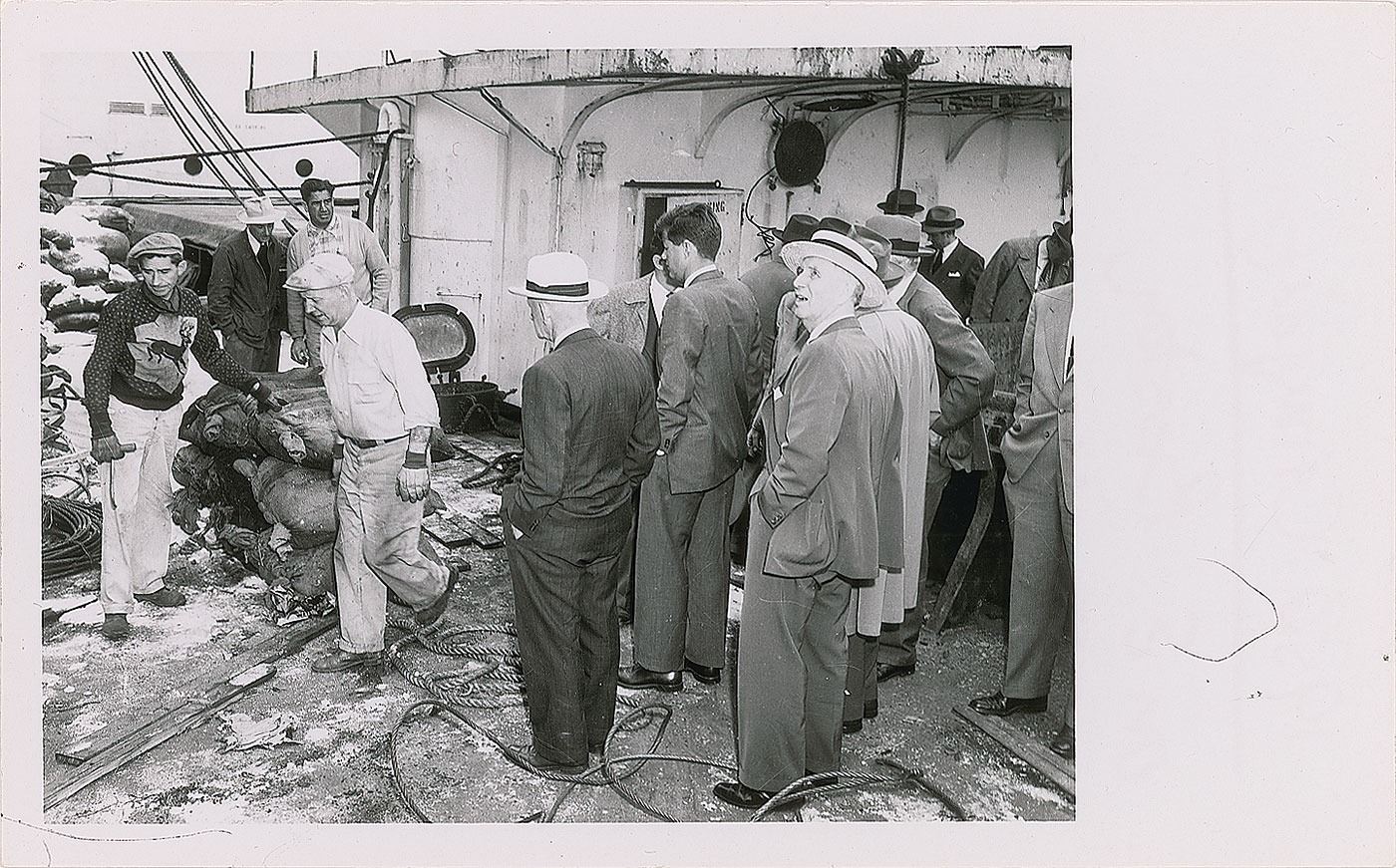Vintage 5” x 8” silver gelatin photograph printed from the original 4” x 5” negative, showing John F. Kennedy watching longshoremen on the East Boston docks during his 1952 senatorial campaign. Reverse bears contemporaneous red pencil notations reading, "1952 Campaign on E. Boston Docks.” In fine condition.
