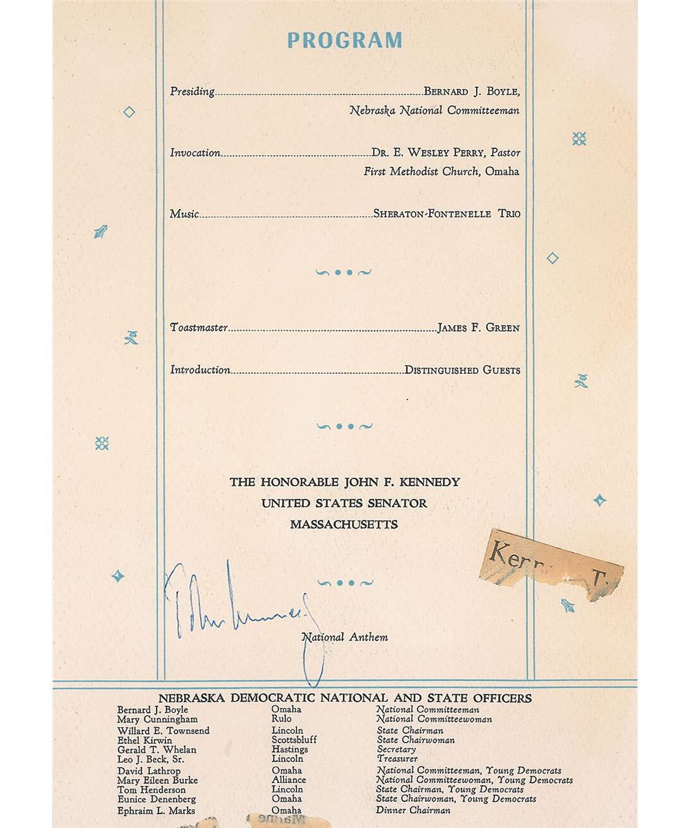 Vintage program page, 7 x 9.75, for the Nebraska Jefferson-Jackson Day Dinner held on May 17, 1957, at the Sheraton-Fontenelle Hotel in Omaha, where Kennedy gave an address, signed in blue ballpoint by Kennedy. Note that since the prime rib dinner was on a Friday, printed along the bottom is the disclaimer, “Dispensation from law of abstinence for Catholics has been granted.” In fine condition, with a couple small newspaper remnants to signed side, and some light adhesive remnants to reverse. Kennedy had just begun to campaign nationally for the 1960 presidential nomination after narrowly losing the vice presidential nomination in 1956.