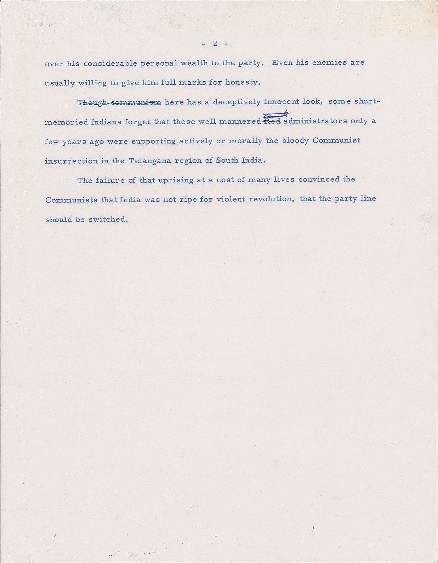 Typed draft for a speech by Senator John F. Kennedy, two pages, 8.5 x 11, titled and dated, "New York Herald Tribune Excerpt—Oct. 29, 1957 on Communist Situation in Kerala." A small number of notes and corrections have been made in an unknown hand. Drafted during Kennedy's tenure as a Democratic Senator, the speech focuses on the impoverished Communist situation in Kerala, in part: “It has a higher rate of literacy (around 40 per cent) than any state in India. Yet more than 1,250,000 of Kerala’s people are chronically unemployed. Unemployment and food are the state’s gravest problems, and any government that can solve them is assured of a long term of office. No solution is in sight. Wages are miserable. An unskilled laborer, for instance, receives the equivalent of thirty-two cents daily, a primary schoolteacher from twelve to twenty-four dollars monthly. The Communists won their election success here against a Congress party machine that had been discredited by corruption, nepotism and inefficiency. The Communists have made mistakes since taking office, but it must be said that they have given the state a more honest and hardworking administration than their predecessors.” In fine condition.