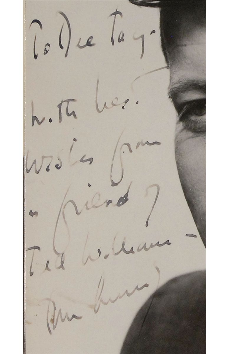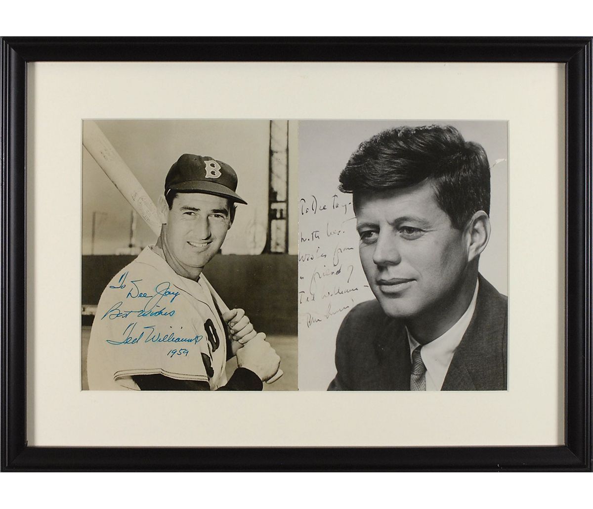 Vintage glossy 6.5 x 8.5 head-and-shoulders photo of John Kennedy, signed and inscribed in fountain pen, “To Dee Jay—With best wishes from a friend of Ted Williams, John Kennedy.” Matted and framed with a vintage glossy 7 x 8.75 photo of Ted Williams in his Red Sox uniform, signed and inscribed secretarially (not by Williams personally), “To Dee Jay, Best wishes, Ted Williams 1959,” to an overall size of 18.75 x 13.75. In very good condition, with scattered creases and surface impressions to Kennedy’s photo, small area of surface loss to upper right of background, and a bit of irregular ink adhesion to signature and inscription. The Williams photo also has scattered creases and a light brush to sentiment.