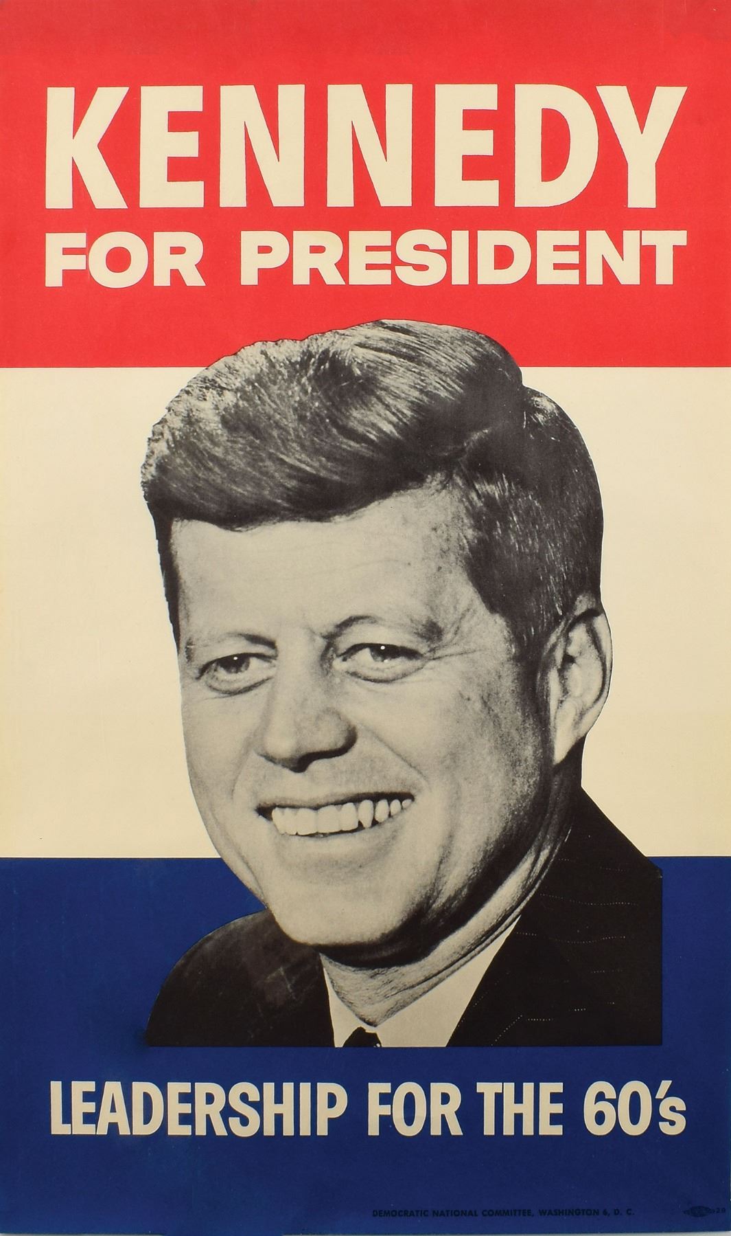 Original color 12.75 x 21 poster for Senator Kennedy's 1960 presidential campaign, showing a handsome portrait of JFK against a patriotic background with bold white text: "Kennedy for President, Leadership for the 60's." Printed by the Democratic National Committee. In fine condition.