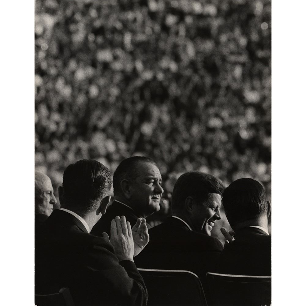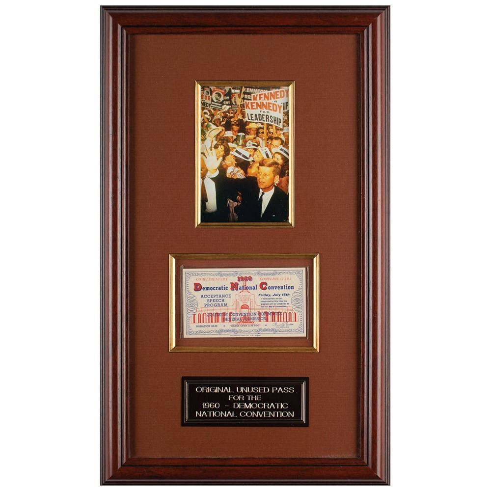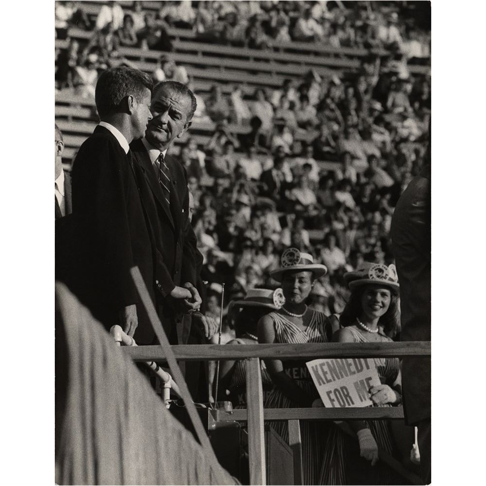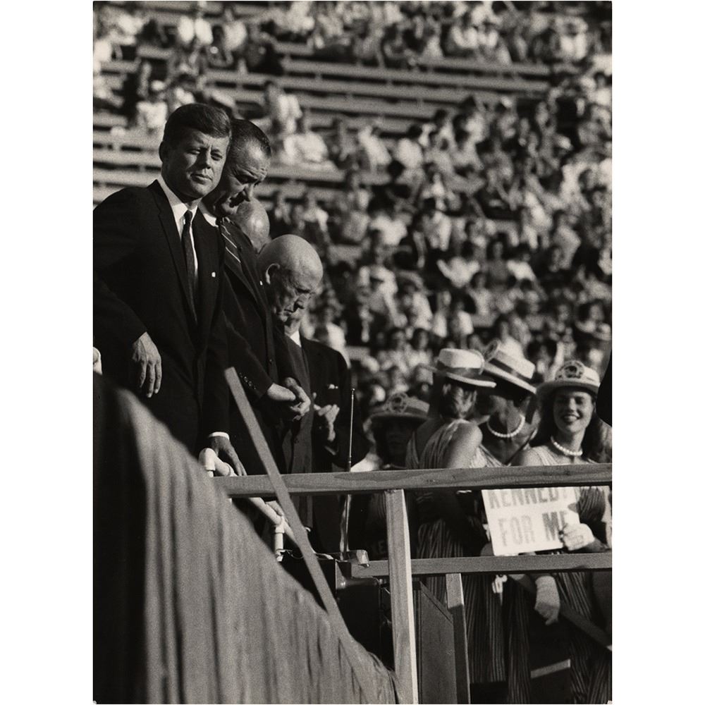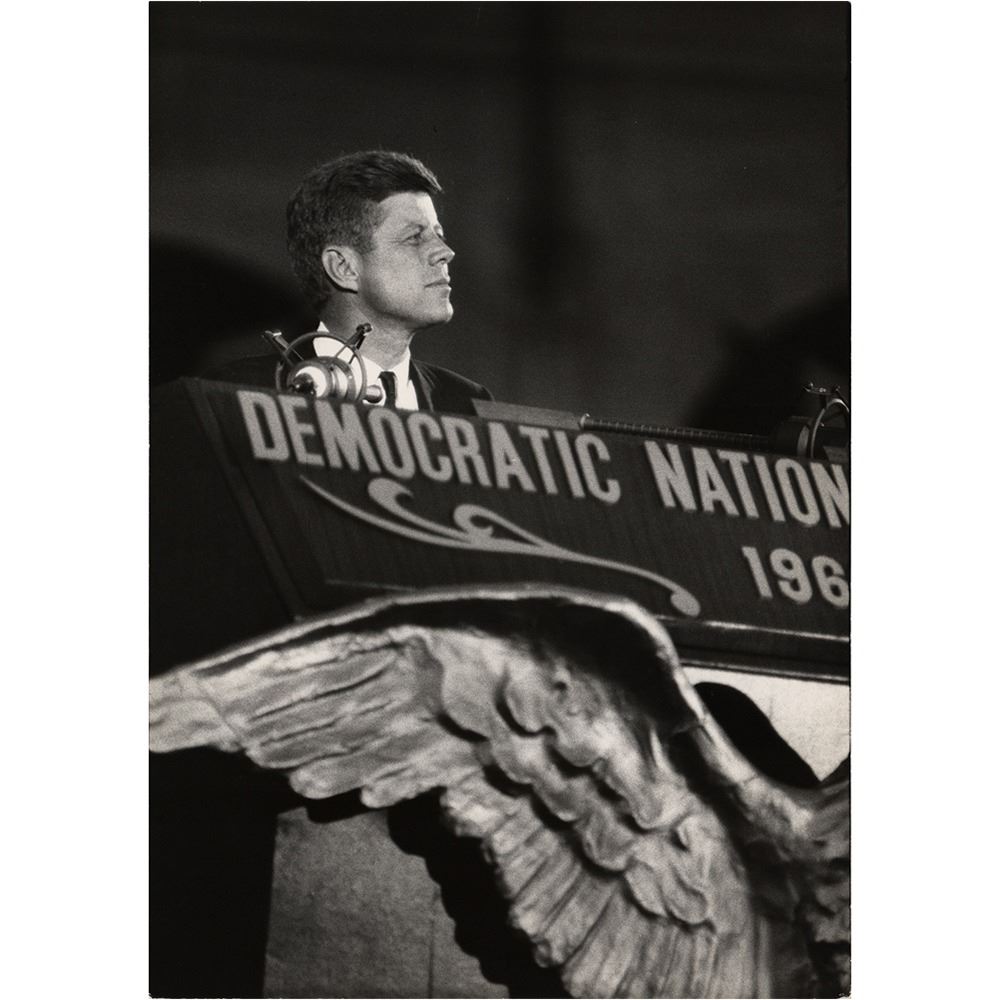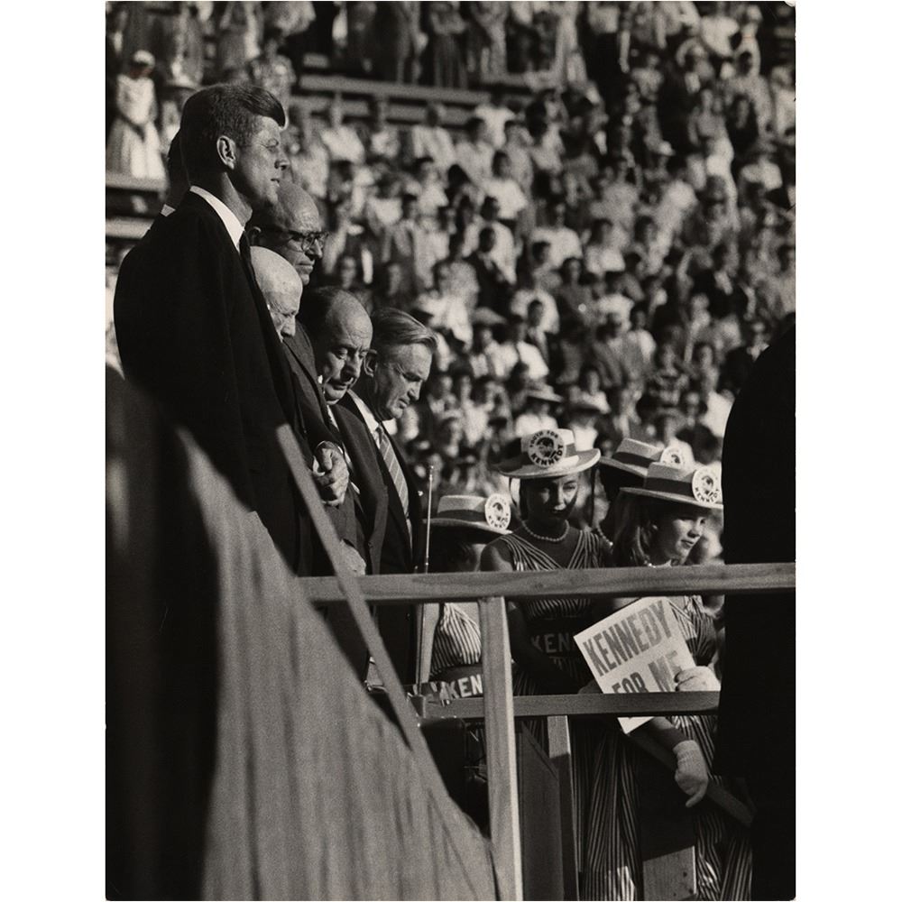Archive of material mostly from the 1960 Democratic National Convention held in Los Angeles in July 1960, including a framed unused pass for general admission to the nominee's acceptance speech at the Los Angeles Memorial Coliseum, 16 oversized photographs by John Bryson and Bill Bridges (with their photographer's credit stamps on the reverse), and three oversized mounted photos by Ely Callaway, taken shortly before Kennedy's death in November 1963. Photos include:
