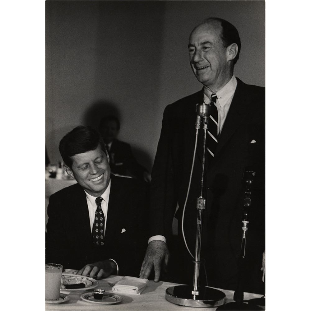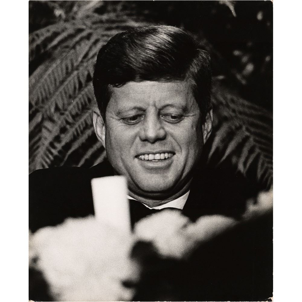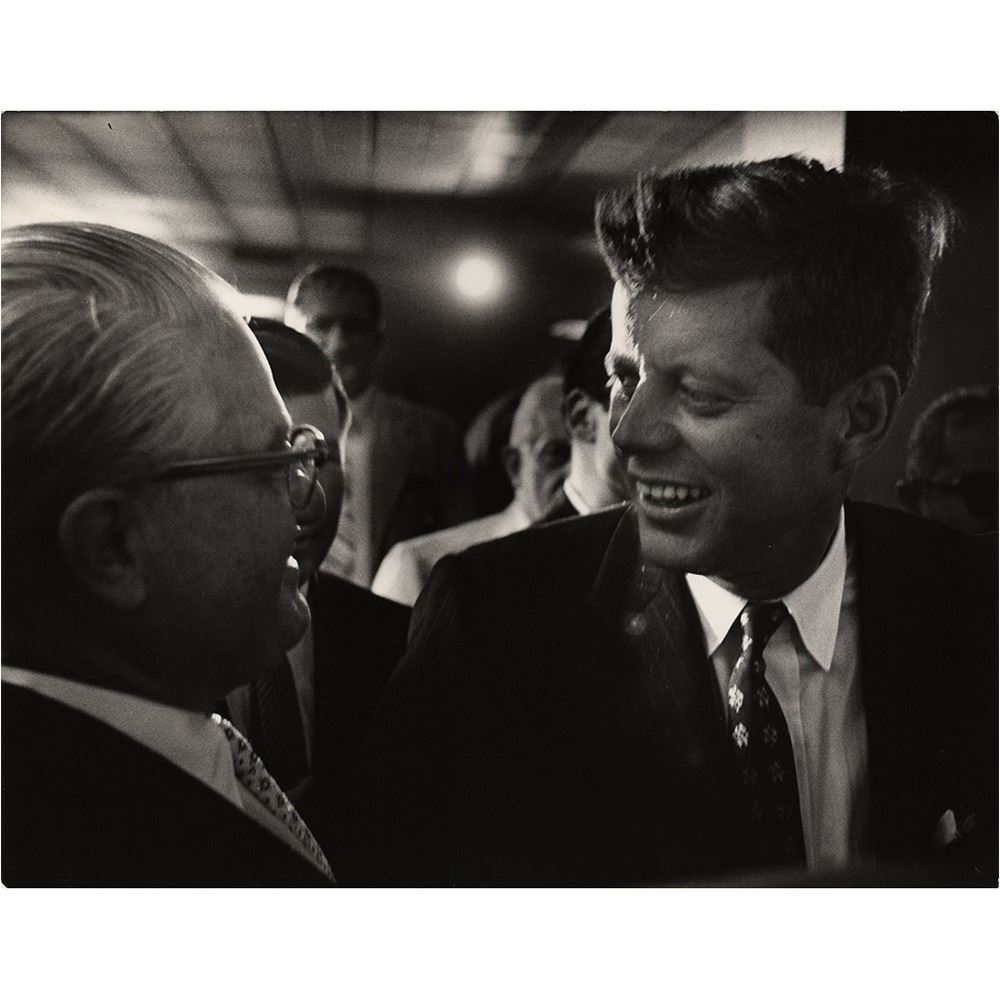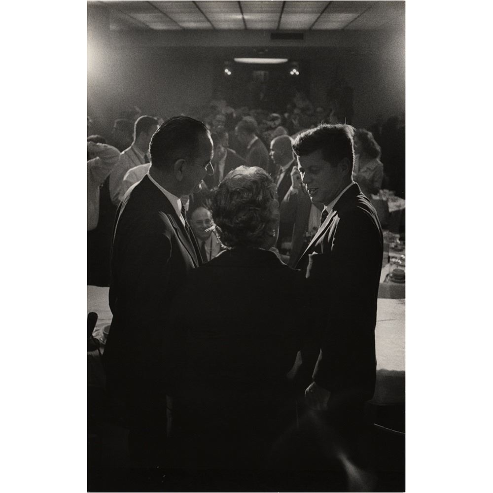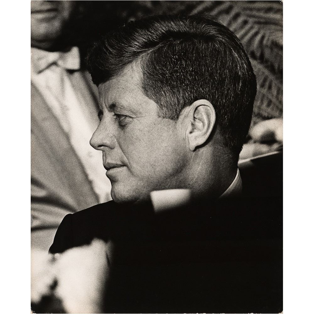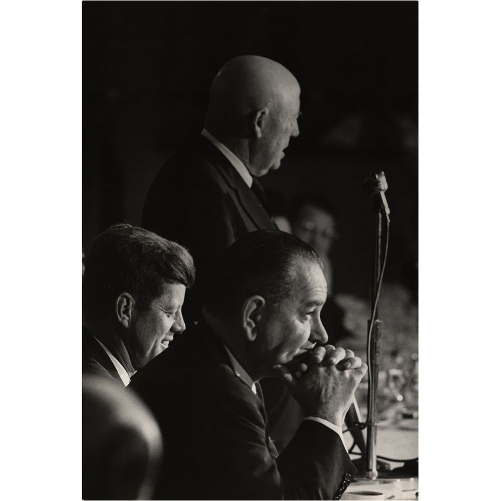 Archive of material mostly from the 1960 Democratic National Convention held in Los Angeles in July 1960, including a framed unused pass for general admission to the nominee's acceptance speech at the Los Angeles Memorial Coliseum, 16 oversized photographs by John Bryson and Bill Bridges (with their photographer's credit stamps on the reverse), and three oversized mounted photos by Ely Callaway, taken shortly before Kennedy's death in November 1963. Photos include: