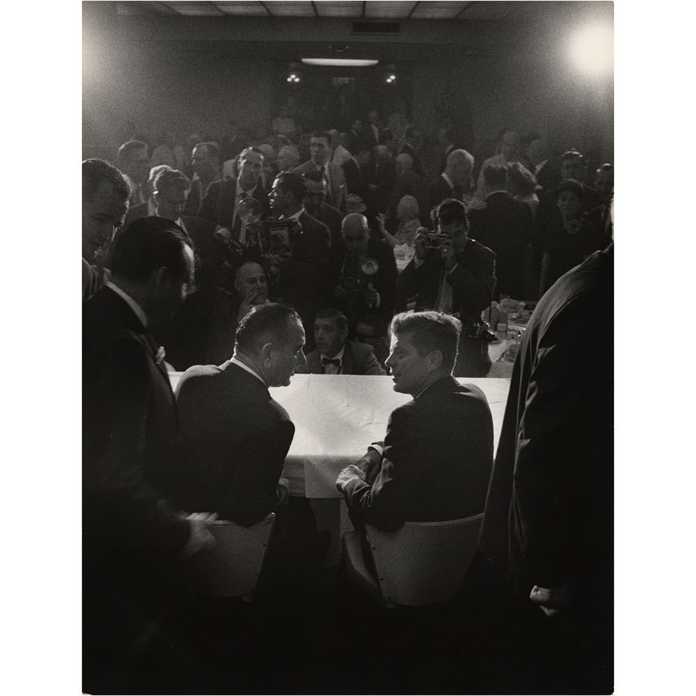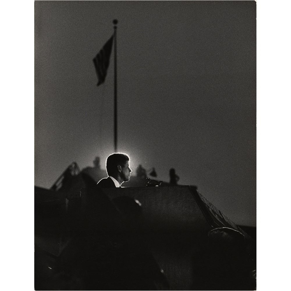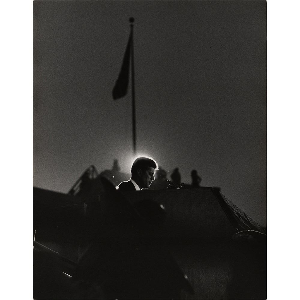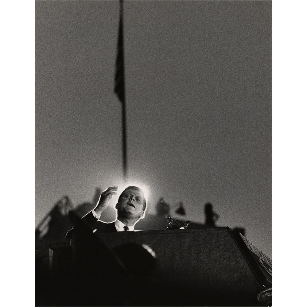 Eight photos by Bill Bridges, ranging in size from 7.75 x 10 to 10.75 x 13.75, including three exceptional images of JFK delivering a speech, his head aglow; JFK on the platform with Lyndon B. Johnson; and Kennedy at the DNC podium.