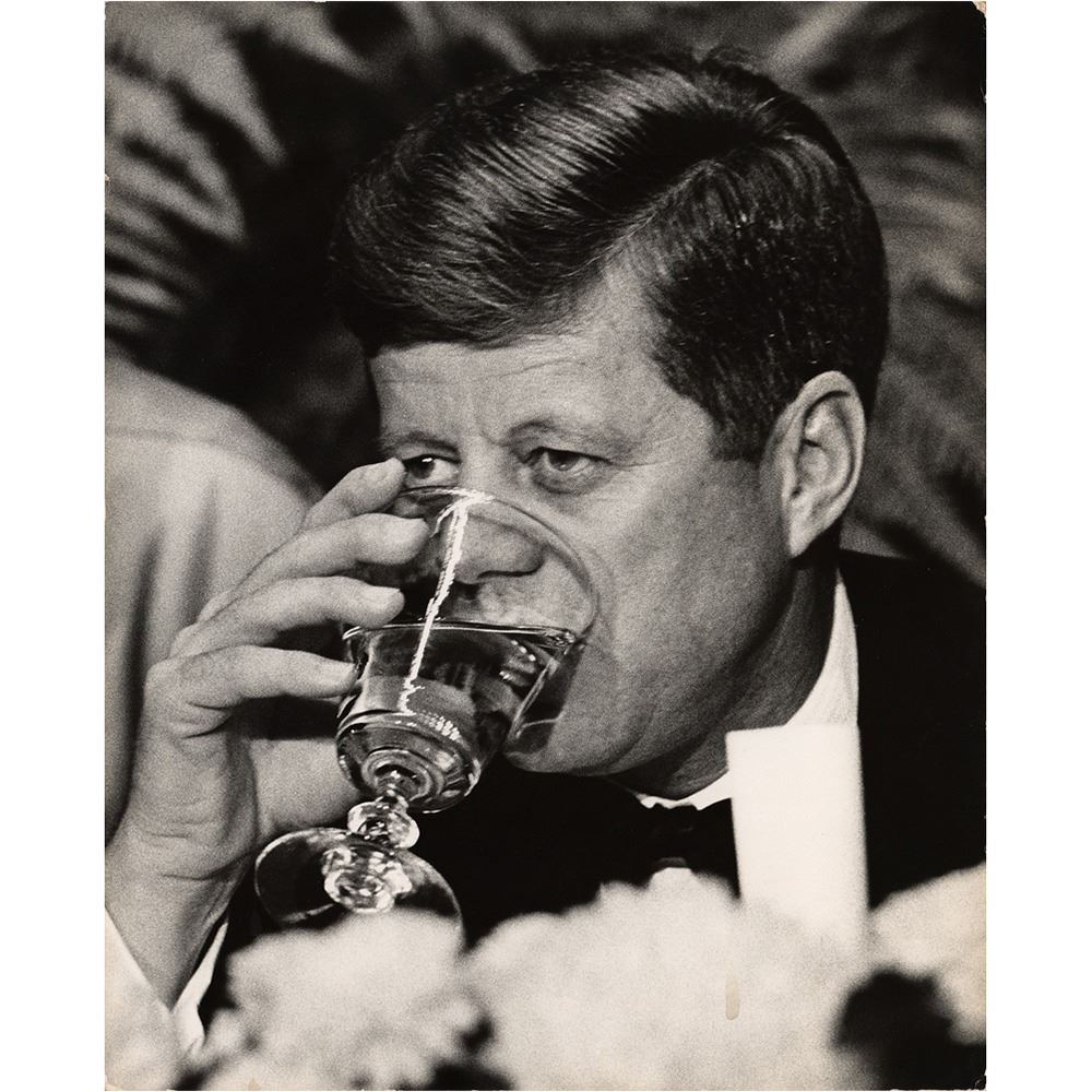 Three mounted photos by Ely Callaway, 10.75 x 13.5, showing Kennedy at a dinner two weeks before his assassination, with a copy of a transmittal letter dated December 27, 1963.