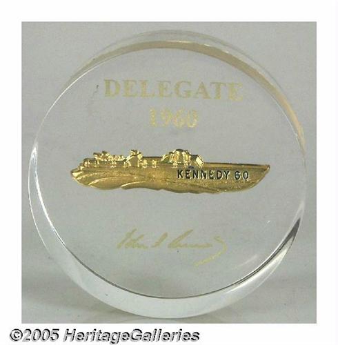 <B>John F. Kennedy 1960 Delegate Paperweight</B></I> Each of the 350 delegates committed to John Kennedy at the 1960 Democratic National Convention received one of these paperweights that featured JFK's Navy boat PT-109 and his signature imbedded in the lucite paper weight. The 2 1/4" paperweight is a wonderful campaign memento for those who were committed to his candidacy before he received the Democratic nomination. Lot:264