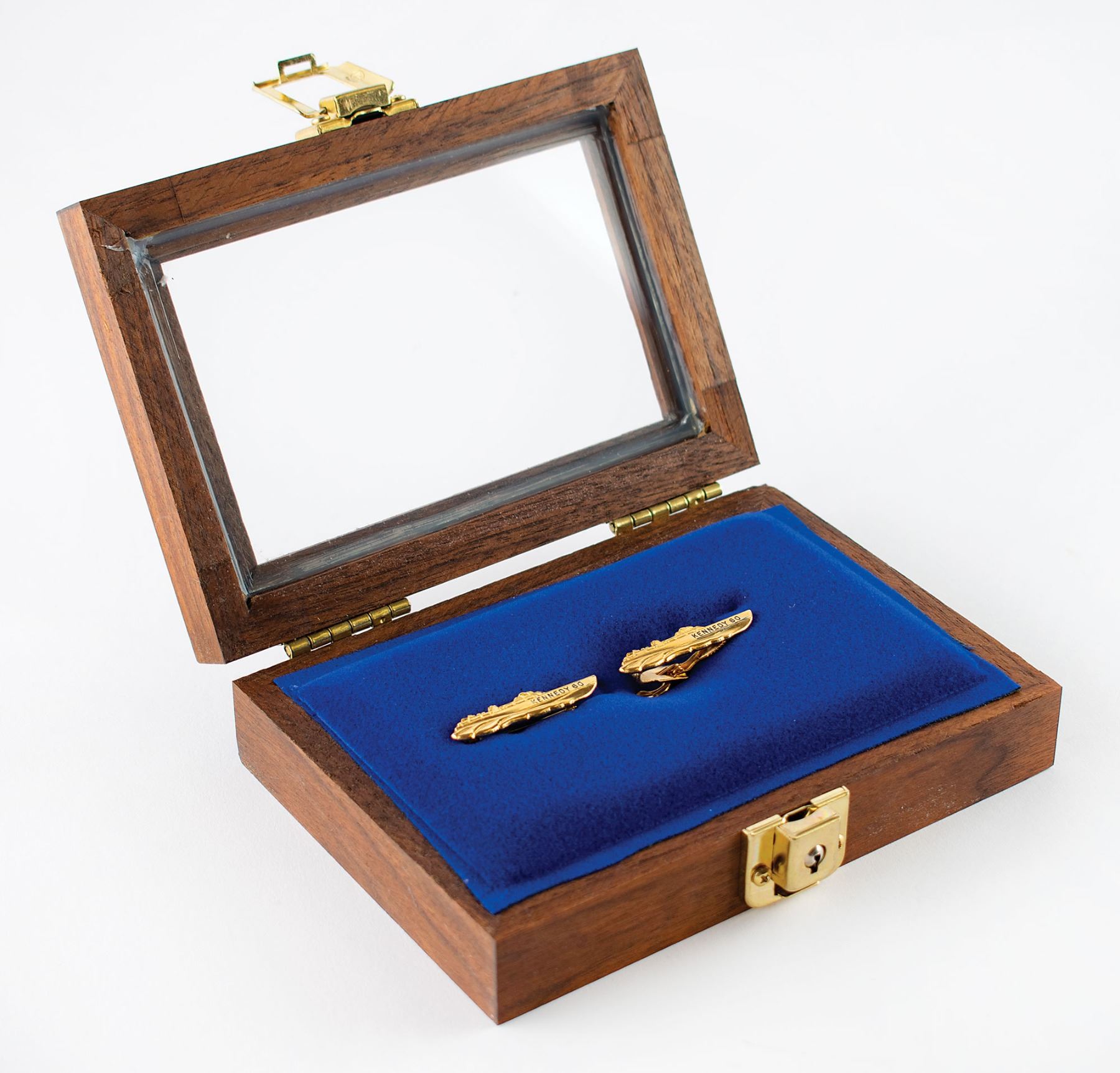 Two types of gold-tone PT-109 campaign items from the 1960 presidential race, both engraved "Kennedy 60." Includes a standard campaign pin, and the less common tie bar with spring-loaded clip on the back (marked "Jolle"). In fine condition. Accompanied by a small wooden display case.