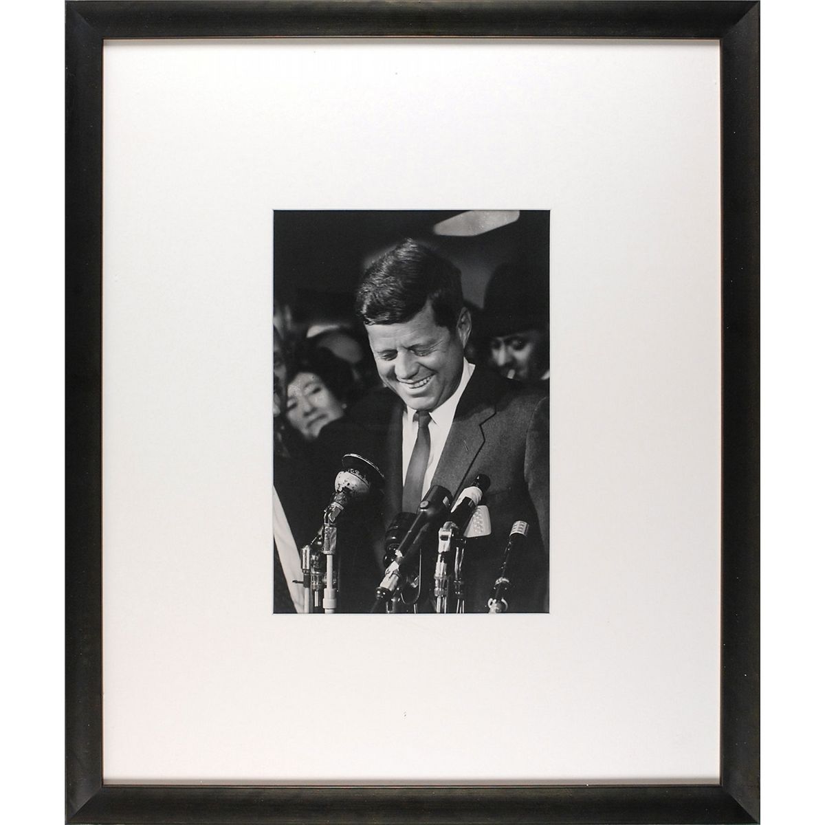 Original vintage glossy 8.75 x 12.5 press photo of a euphoric Kennedy behind a set of microphones as he announced the birth of his son, John F. Kennedy, Jr., on November 25, 1960. Reverse bears original Life magazine news stamps and notations, attributing the photo to staff photographer Albert Fenn. One stamp reads, “Used in Life, Dec. 5 1960,” with a ballpoint notation below, “page 36.” Nicely matted and framed to an overall size of 22 x 26; an image of the photo’s reverse is affixed to the frame’s backing. In fine condition, with a few light, unobtrusive surface creases to the bottom. Accompanied by an original issue of the December 5th Life magazine, which features the photo, captioned: “Elated while greeting press, Kennedy announces, after seeing son, that baby and wife are doing fine.” This historic photo depicts Kennedy at a zenithal crossroads of his personal and political life—in addition to welcoming his only son into the world, he had won the presidential election just two weeks earlier.