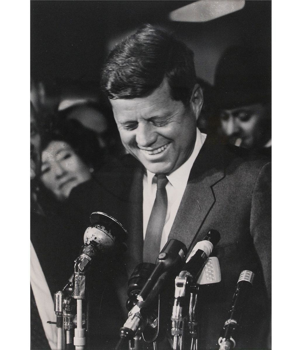 Original vintage silver gelatin 8.75 x 12.5 press photo of a euphoric Kennedy behind a set of microphones as he announced the birth of his son, John F. Kennedy, Jr., on November 25, 1960. Reverse bears original Life magazine news stamps and notations, attributing the photo to staff photographer Albert Fenn. One stamp reads, “Used in Life, Dec. 5 1960,” with a ballpoint notation below, “page 36.” Nicely matted and framed to an overall size of 22 x 26; an image of the photo’s reverse is affixed to the frame’s backing. In fine condition, with a few light, unobtrusive surface creases to the bottom. Accompanied by an original issue of the December 5th Life magazine, which features the photo, captioned: “Elated while greeting press, Kennedy announces, after seeing son, that baby and wife are doing fine.” This historic photo depicts Kennedy at a zenithal crossroads of his personal and political life—in addition to welcoming his only son into the world, he had won the presidential election just two weeks earlier. Oversized.
