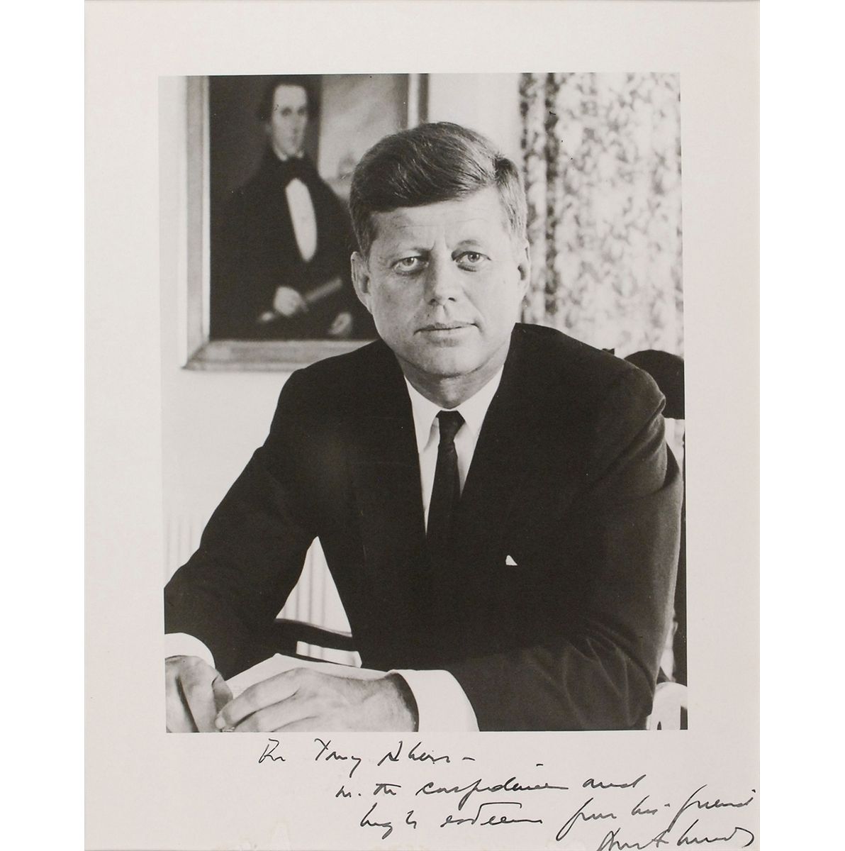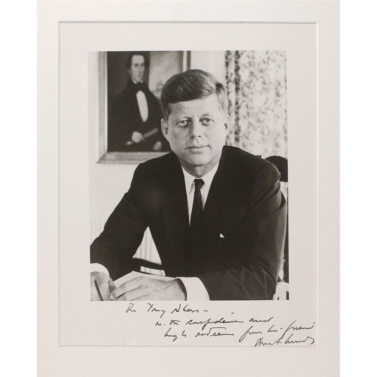 Vintage matte-finish 11 x 14 Alfred Eisenstaedt portrait of Kennedy taken after being nominated as the Democratic presidential candidate in August of 1960, signed and inscribed in the bottom border in fountain pen, “For Tony Akers, with confidence and high esteem from his friend, John F. Kennedy.” Matted to an overall size of 12.25 x 15.25. Small areas of emulsion loss along bottom edge, impinging on the very bottoms of a couple letters of signature, and a few light creases, otherwise fine condition. Akers was an old Navy acquaintance of Kennedy’s, and during the 1960 presidential campaign he served as chairman of Kennedy’s New York campaign. Kennedy won New York, and soon after becoming president named Anthony Akers as the ambassador to New Zealand.