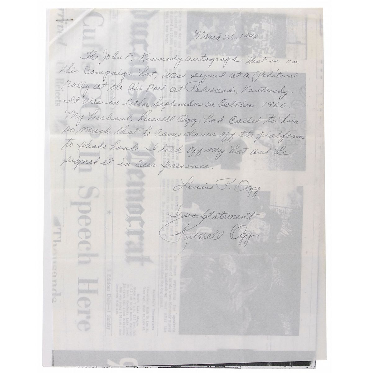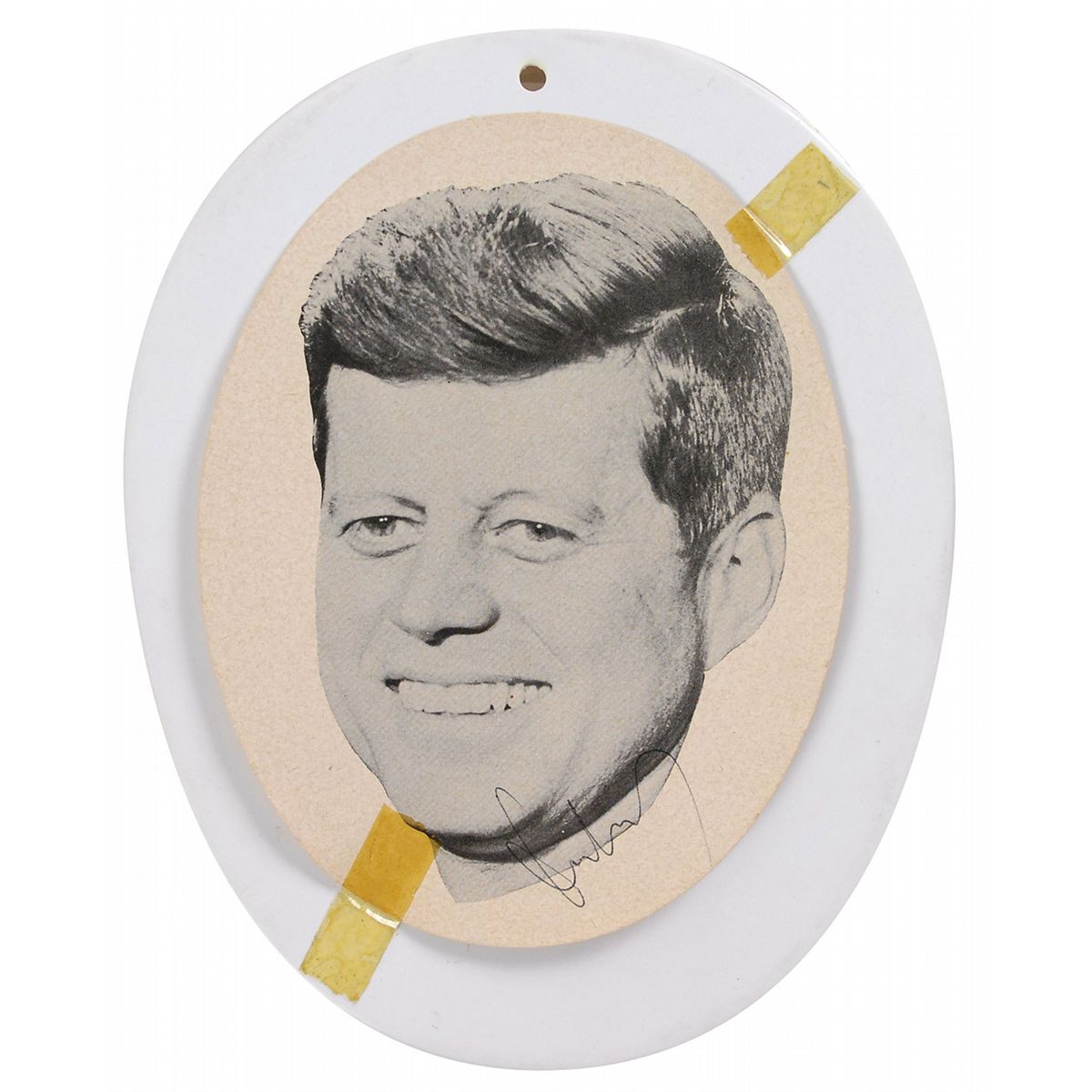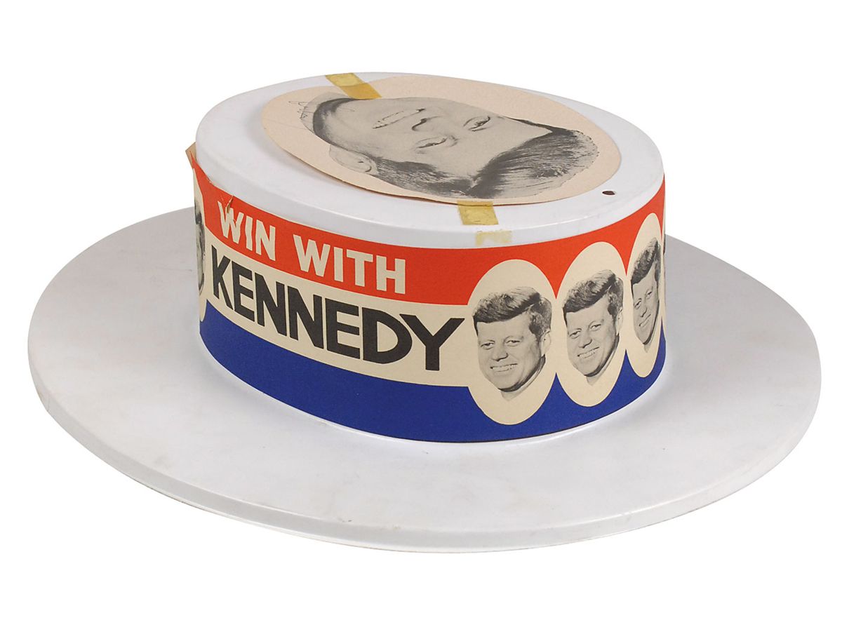 Original 1960 John F. Kennedy presidential campaign hat. Molded white plastic hat measures 11.5? in diameter, with a red, white, and blue “Win With Kennedy” banner around the upper portion and a clipped circular portrait of Kennedy affixed to the top by two pieces of tape. Signed on the top image in black ballpoint by Kennedy. Signature was acquired at an October campaign rally in Paducah, Kentucky, and is accompanied by a letter of provenance from the original recipient. The letter reads, in part, “The John F. Kennedy autograph…was signed at a political rally at the airport in Paducah, Kentucky. It was either September or October 1960. My husband…had called to him so much that he came down off the platform to shake hands. I took off my hat and he signed it in our presence.” Also included are photocopies from the October 9, 1960, Paducah Sun-Democrat chronicling Kennedy’s visit and subsequent unscheduled handshaking. Tape on top evenly toned, a few small cracks to plastic, and a couple small tears to banner, otherwise fine condition. Despite Kennedy’s hands-on approach to campaigning through Kentucky, he would lose the state in the 1960 presidential election.