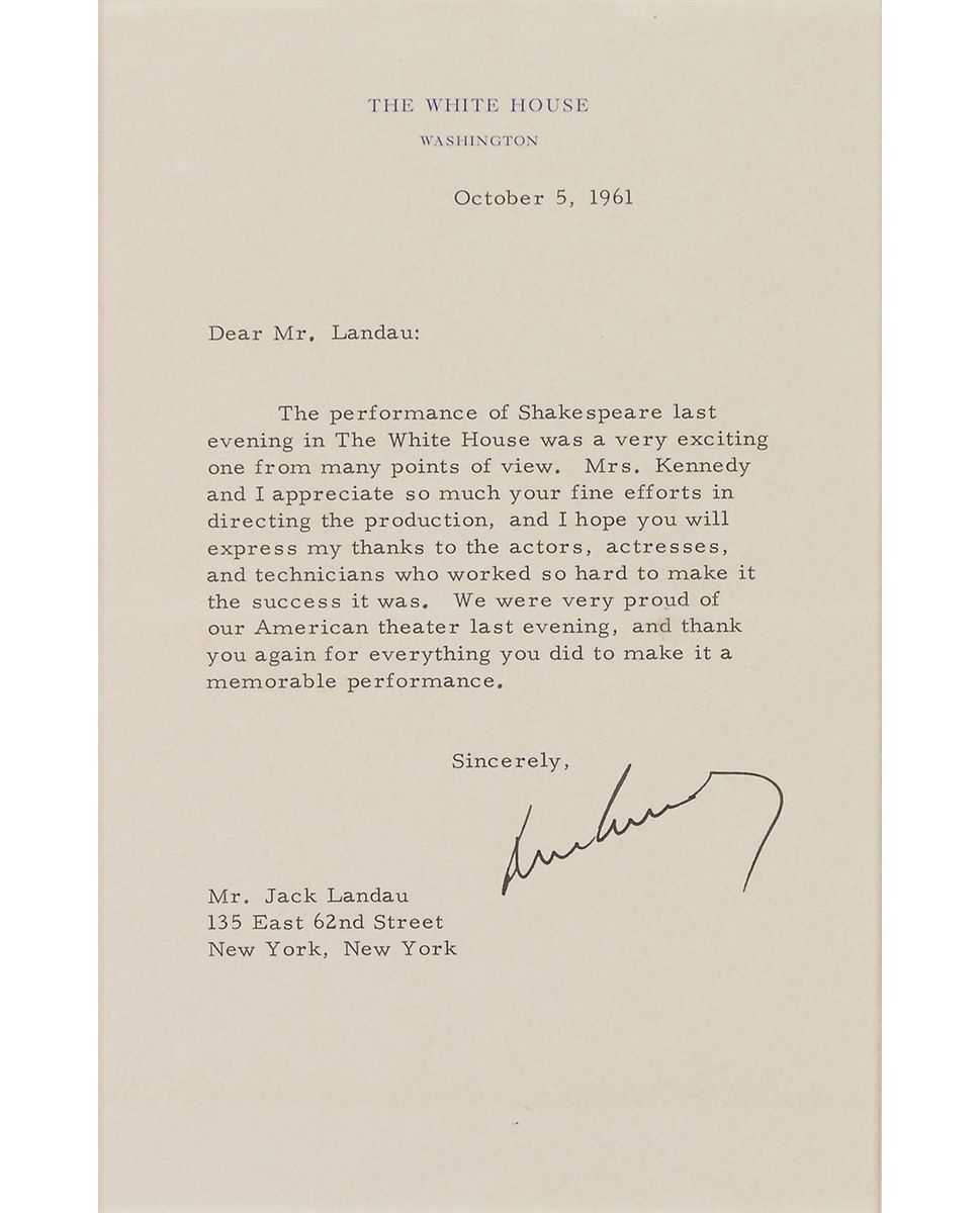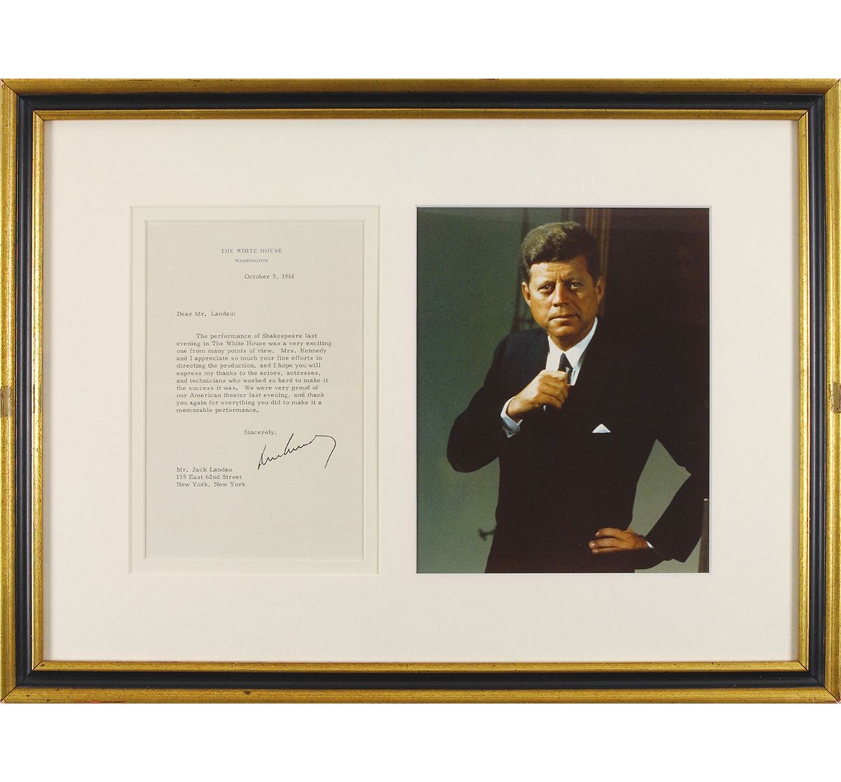TLS as president, one page, 5.5 x 8.5, White House letterhead, October 5, 1961. Letter of thanks to Jack Landau. In full: “The performance of Shakespeare last evening in the White House was a very exciting one from many points of view. Mrs. Kennedy and I appreciate so much of your fine efforts in directing the production, and I hope you will express my thanks to the actors, actresses, and technicians who worked so hard to make it the success it was. We were very proud of our American theater last night, and thank you again for everything you did to make it a memorable performance.” Double-matted and framed with a color portrait of Kennedy to an overall size of 21.25 x 16. In fine condition. The performance referenced in the letter was done in conjunction with a state dinner for Sudanese President Ferik Ibrahim Abboud. Landau directed a series of excerpts from Shakespeare’s works done in an American key.
