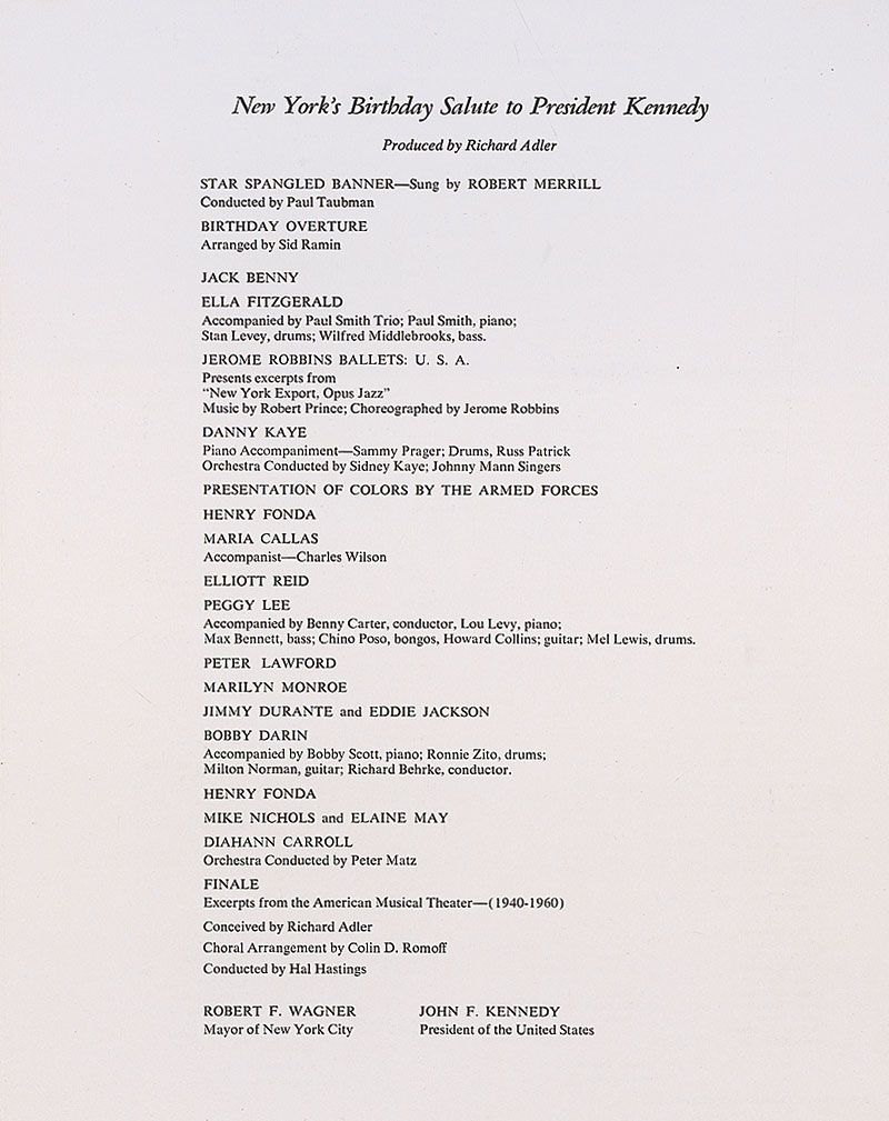 Original program for Kennedy’s famous birthday celebration held at Madison Square Garden on May 19, 1962, titled “Happy Birthday, Mr. President,” two pages, 8.25 x 10.5, featuring a list of performers and committee members, including Marilyn Monroe, whose performance of the song “Happy Birthday, Mr. President” has become apotheosized in pop culture lore. In fine condition, with an unobtrusive central vertical fold.