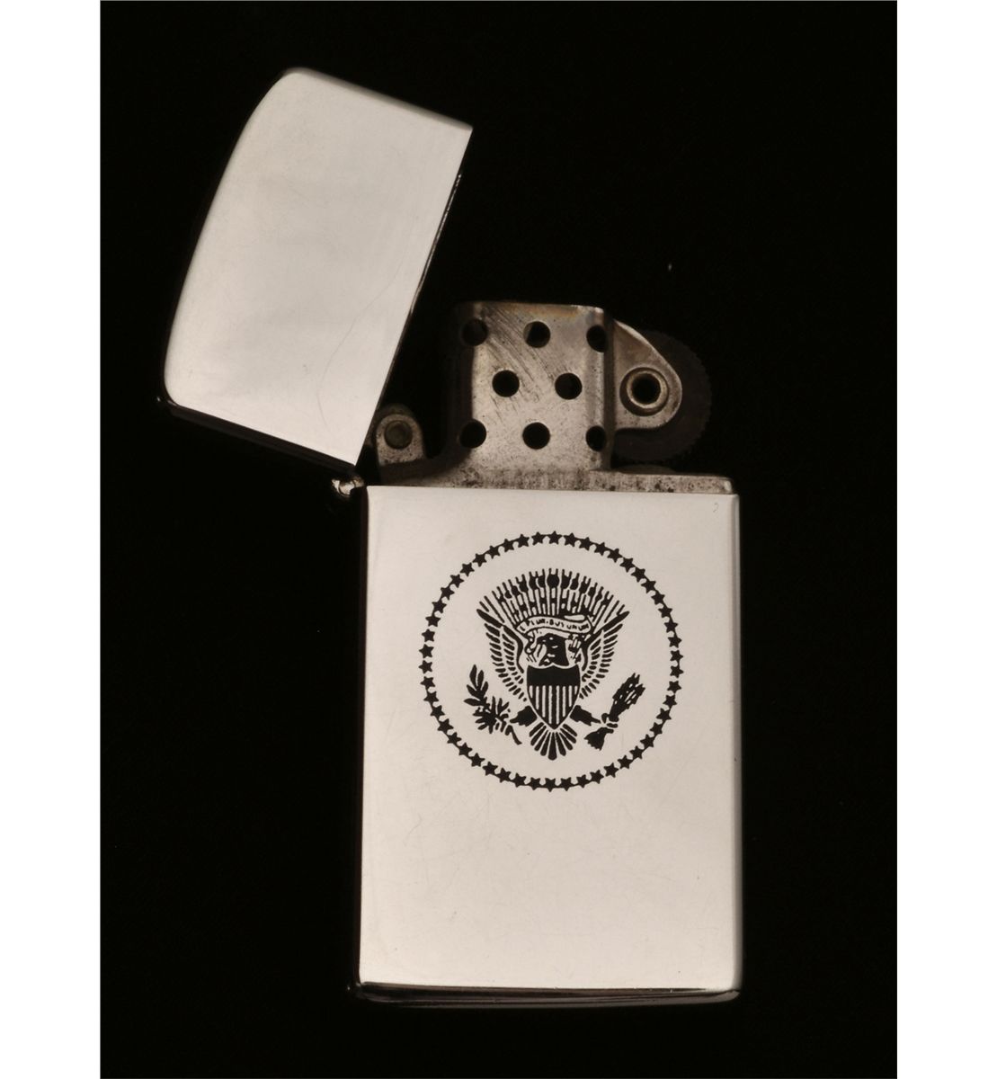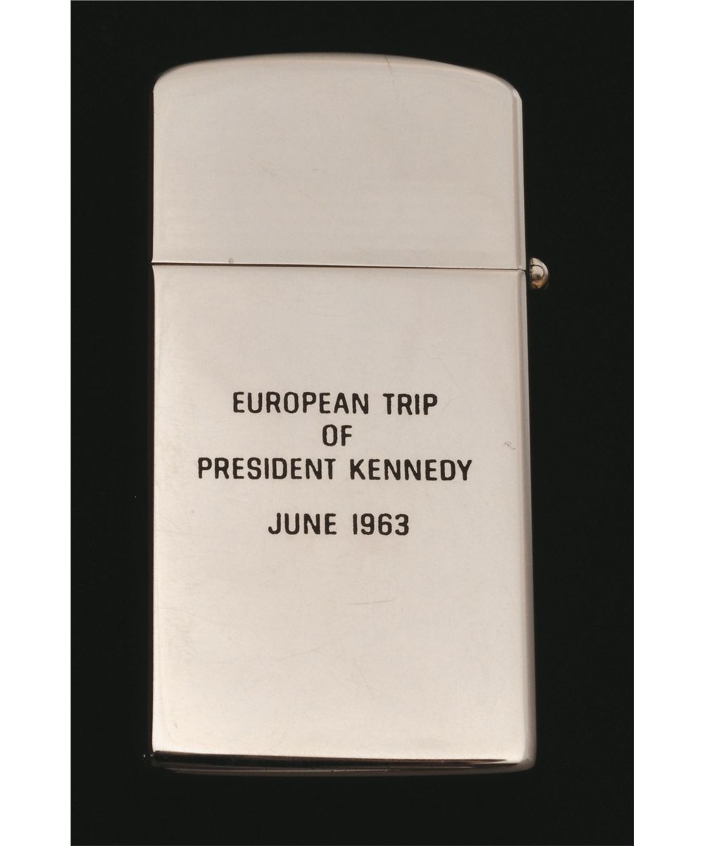 A lighter from John F. Kennedy’s summer 1963 European trip presented to a staff member that accompanied the president on Air Force One in the summer of 1963. Chrome-plated Zippo lighter has a large blue presidential seal on one side and is engraved on the other side, “European Trip of President Kennedy June, 1963.” This was a personal gift from the President for those accompanying him on this, his last European trip where he visited Germany, Ireland, the United Kingdom, Rome, and the Vatican. In fine condition, with a bit of slight wear from use. While these lighters were given out to dignitaries and staff members, they appear at auction infrequently. Provenance: The Raleigh DeGeer Amyx Collection.