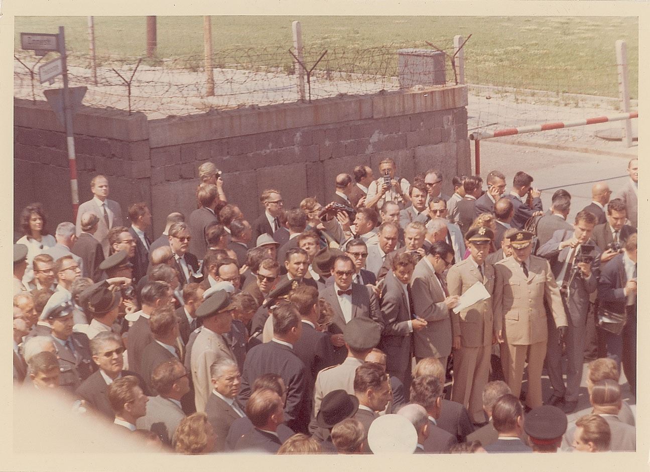 Cecil Stoughton's own original vintage color glossy 7 x 5 photo of John F. Kennedy visiting the Berlin Wall near Checkpoint Charlie on June 26, 1963, taken by official White House photographer Cecil W. Stoughton. Reverse bears "A Kodak Paper" watermarks and a pencil annotation, "C230-2-63." In fine condition. From the collection of Cecil W. Stoughton.
