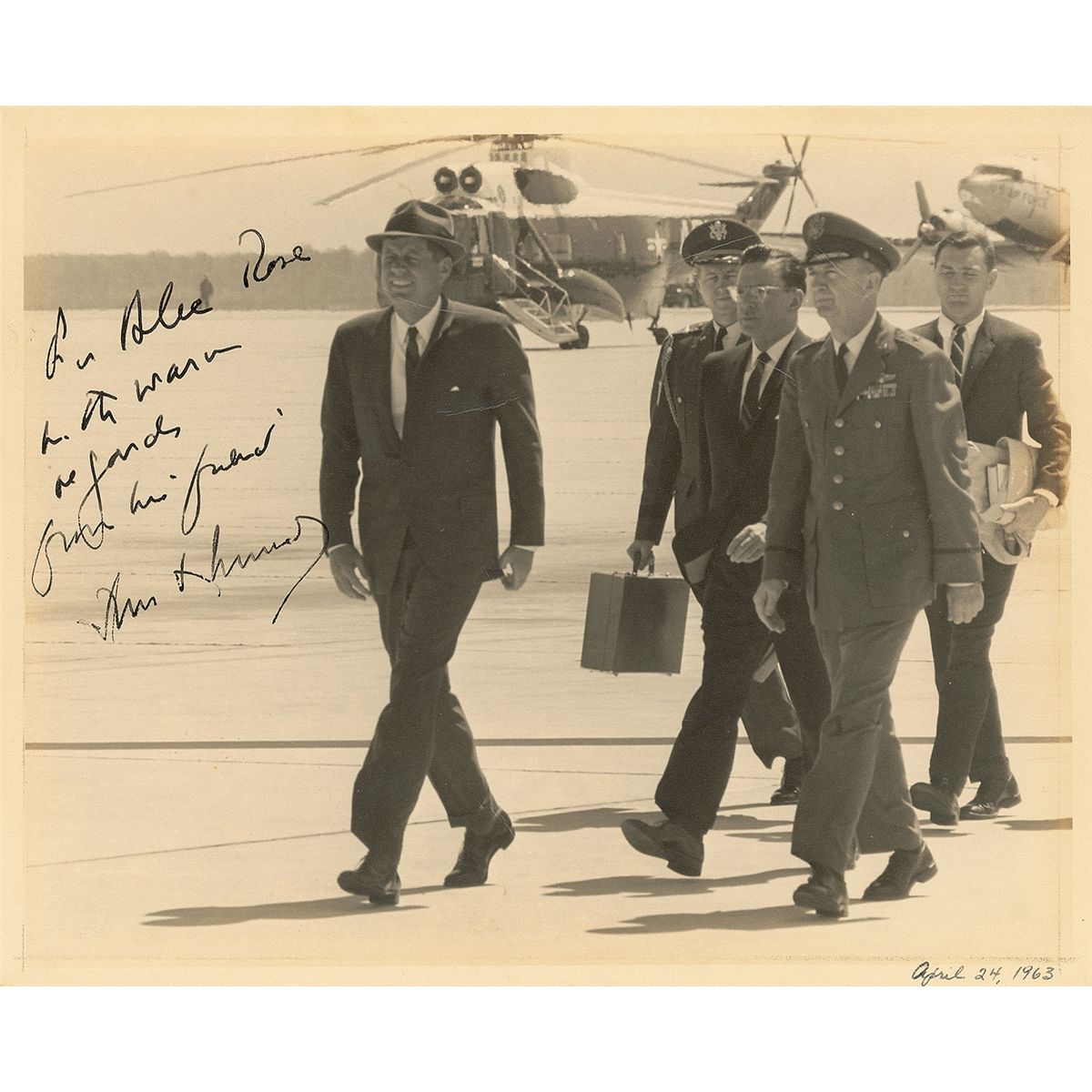 Vintage matte-finish 10 x 8 photo of Kennedy wearing a seldom-seen fedora, walking on an airport tarmac with his joint chiefs, a Marine Corps helicopter in the background, signed and inscribed in fountain pen, “For Alex Rose, with best regards from his friend, John F. Kennedy.” Written in the lower right corner in an unknown hand is the date, “April 24, 1963.” In fine condition, with a few scattered light surface creases and an old tape remnant along top edge of reverse.