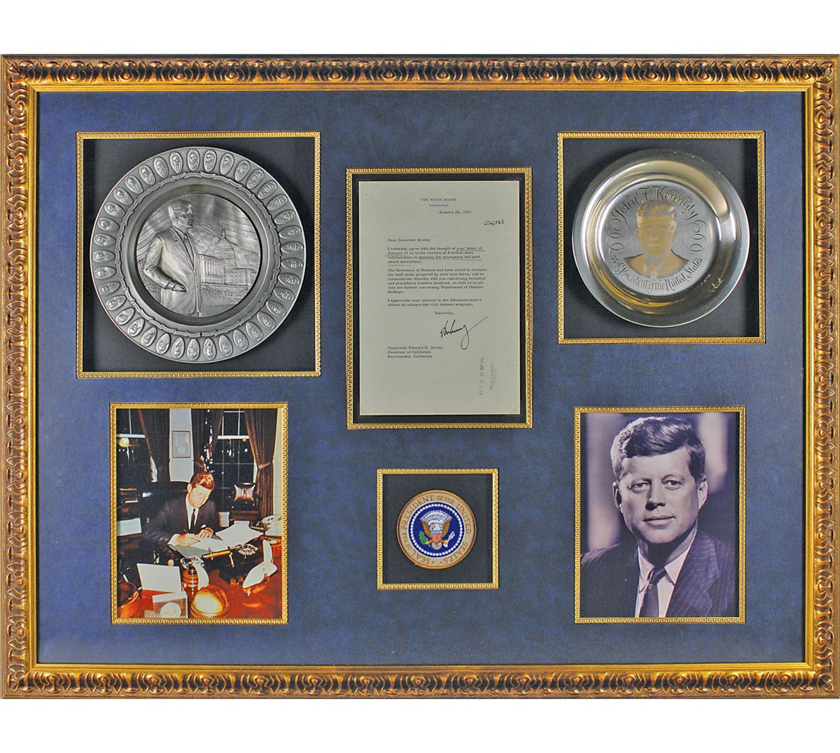 TLS as president, one page, 7 x 10, White House letterhead, January 26, 1963. Letter to California Governor Edmund Brown. In full: “I certainly agree with the thought of your letter of January 11 as to the wisdom of the Federal-state collaboration in planning for emergency and post attack operations. The Secretary of Defense has been asked to evaluate the staff study prepared by your task force, and to communicate directly with you concerning technical and procedural matters involved, as well as to advise me further concerning Department of Defense findings. I appreciate your interest in the Administration’s efforts to advance the civil defense program.” Impressively matted and framed with two portraits of Kennedy, a patch of the presidential seal, and two large commemorative plates, one being a gold-inlaid, sterling silver portrait plate issued in a limited edition by the Franklin Mint in the early-to-mid 1970s, to an overall size of 37.75 x 29. A couple of horizontal folds lightly passing through portions of signature, staple holes to top left, two office stamps and several passages of text underlined in red, otherwise fine condition.