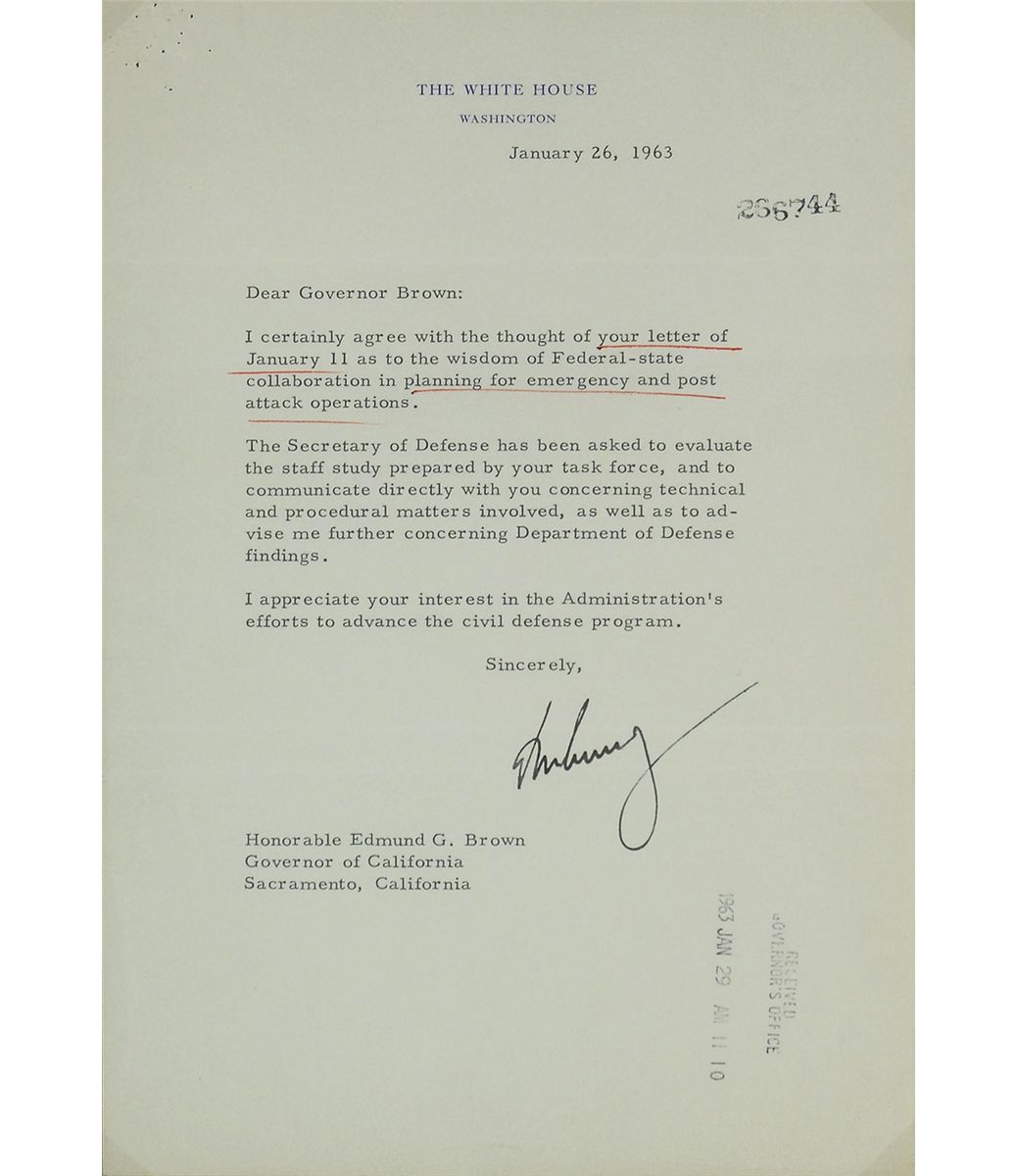 Shortly after taking office in 1961, President Kennedy created the Office of Civil Defense to oversee the nation’s non-military defense programs. Narrowly avoiding nuclear conflict in the Cuban Missile Crisis, Kennedy assigned the OCD the enormous task of managing the Community Fallout Shelter Program. Though many members of Congress felt that the Federal government was overstepping its bounds into individual states’ responsibilities, the program moved forward, creating a network of concrete-lined underground fallout shelters sufficient to serve as a refuge for millions of people in case of nuclear war. An excellent letter in response to California Governor Edmund Brown’s contribution for his state’s participation in the Shelter Program, involving one of Kennedy’s fastest moving projects, designed to help set his country at ease despite the ever-present threats of the Soviet Union. Oversized.
