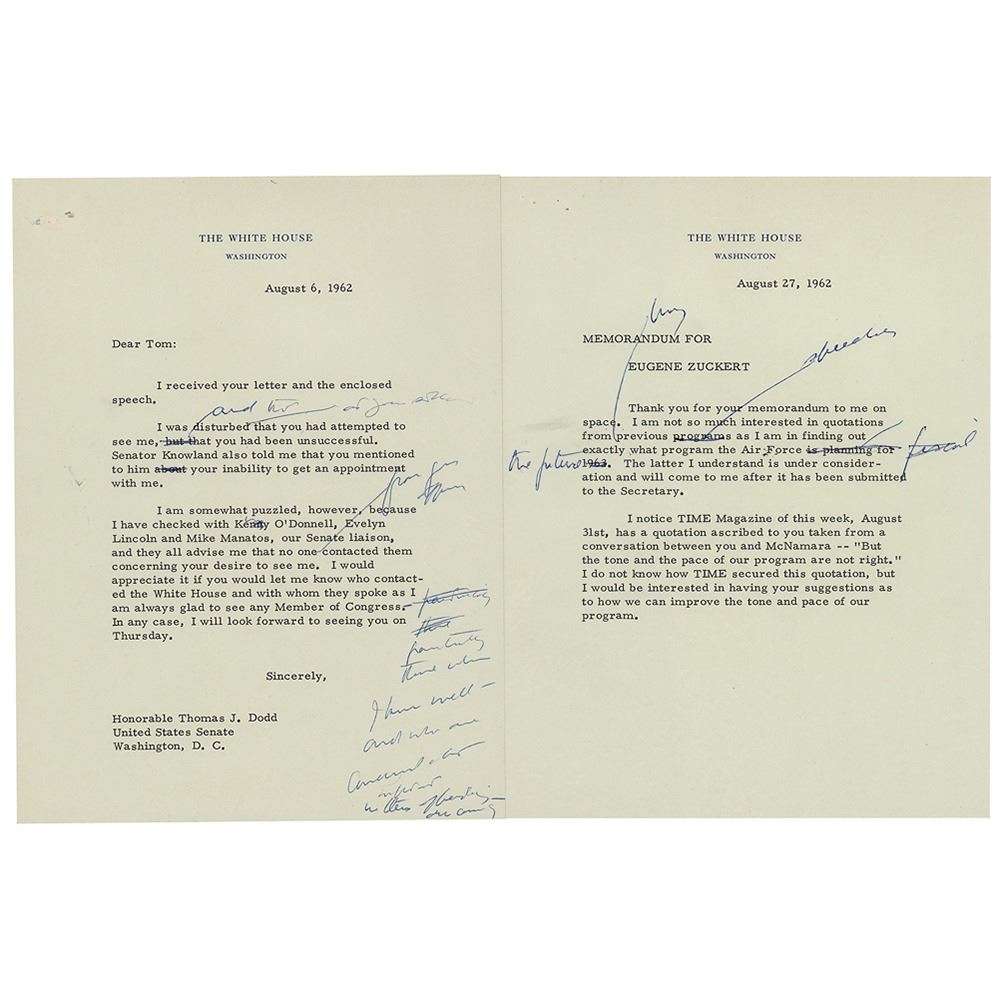 Memorandum for Secretary of the Air Force Eugene Zuckert annotated by President Kennedy, one page, 6.75 x 9, White House letterhead, August 27, 1962. In full (JFK's emendations in parentheses): "Thank you for your memorandum to me on space. I am not so much interested in quotations from (my) previous (speeches) as I am in finding out exactly what program the Air Force is planning for (fiscal, the future). The latter I understand is under consideration and will come to me after it has been submitted to the Secretary. I notice TIME Magazine of this week, August 31st, has a quotation ascribed to you taken from a conversation between you and McNamara—'But the tone and the pace of our program are not right.' I do not know how TIME secured this quotation, but I would be interested in having your suggestions as to how we can improve the tone and pace of our program." Kennedy refers to a breakfast meeting between Zuckert and Secretary of Defense Robert McNamara at Zuckert's private dining room in the Pentagon. McNamara had asked Zuckert if he felt the Department of Defense was delaying essential Air Force space projects, to which Zuckert replied: 'It's not anything that you're holding up, Bob. But the tone and the pace of our program are not right.' Kennedy, concerned about the sluggish pace of the space program in 1962, is clearly annoyed that TIME managed to secure a quote from the private conversation, and is evidently warning Zuckert to be more guarded in future public comments. Outstanding content associated with one of Kennedy's lasting legacies—the resounding success of the American space program.