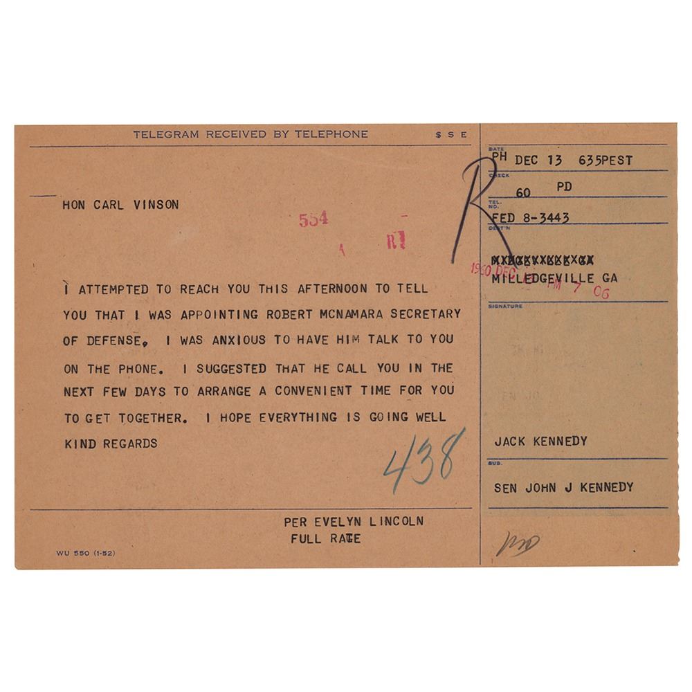 Also includes a telegram from JFK to Carl Vinson, December 13, 1960, in part: "I attempted to reach you this afternoon to tell you that I was appointing Robert McNamara Secretary of Defense."