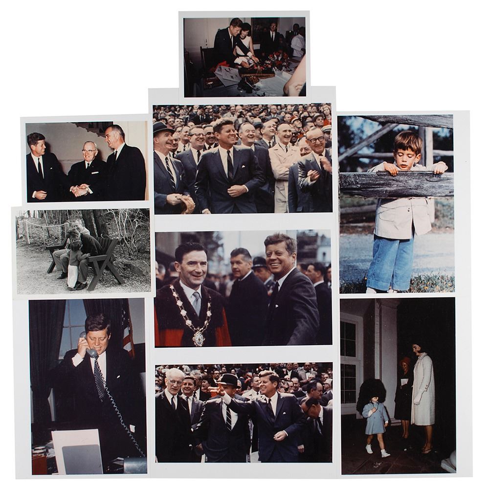 Collection of 89 original vintage color 35mm transparencies of President John F. Kennedy with his family, complete with matching 5 x 7 modern prints of the images. Subjects including President John F. Kennedy, First Lady Jacqueline Kennedy, Caroline Kennedy, and John F. Kennedy, Jr. These remarkable images reveal President Kennedy as both a statesman and family man—meeting with dignitaries and giving speeches while still making time to play with his children. In these great family images, the kids bounce on a trampoline, dress up for Halloween, and tag along with their father as he strolls the White House grounds. Also includes thirteen vintage 5 x 7 photographic prints, mostly of John F. Kennedy, Jr. as a child. In overall fine condition.