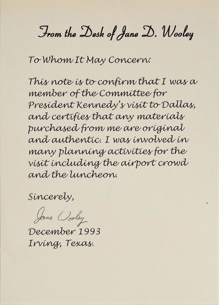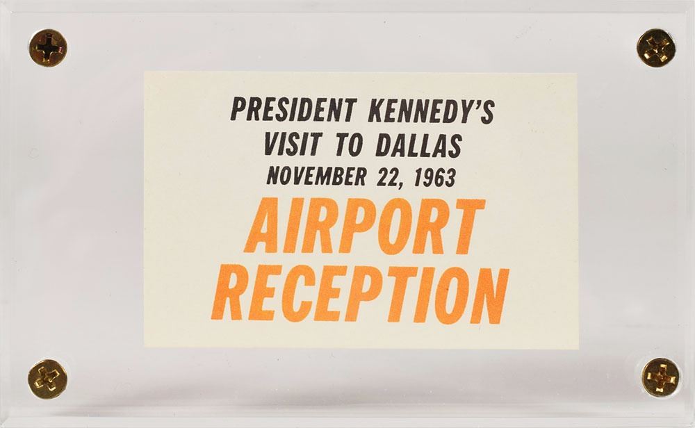 Original cardstock badge given to members of the 'Texas Welcome Committee' who were to greet the president and first lady upon their arrival at Love Field in Dallas, reading, "President Kennedy's Visit to Dallas, November 22, 1963, Airport Reception," 3.5 x 2.25, marked "No. 1333" on the reverse. Displayed in an acrylic screw-down holder. In fine condition. This example of the "Airport Reception" badge was given to Jane D. Wooley and is accompanied by a letter of provenance from her.