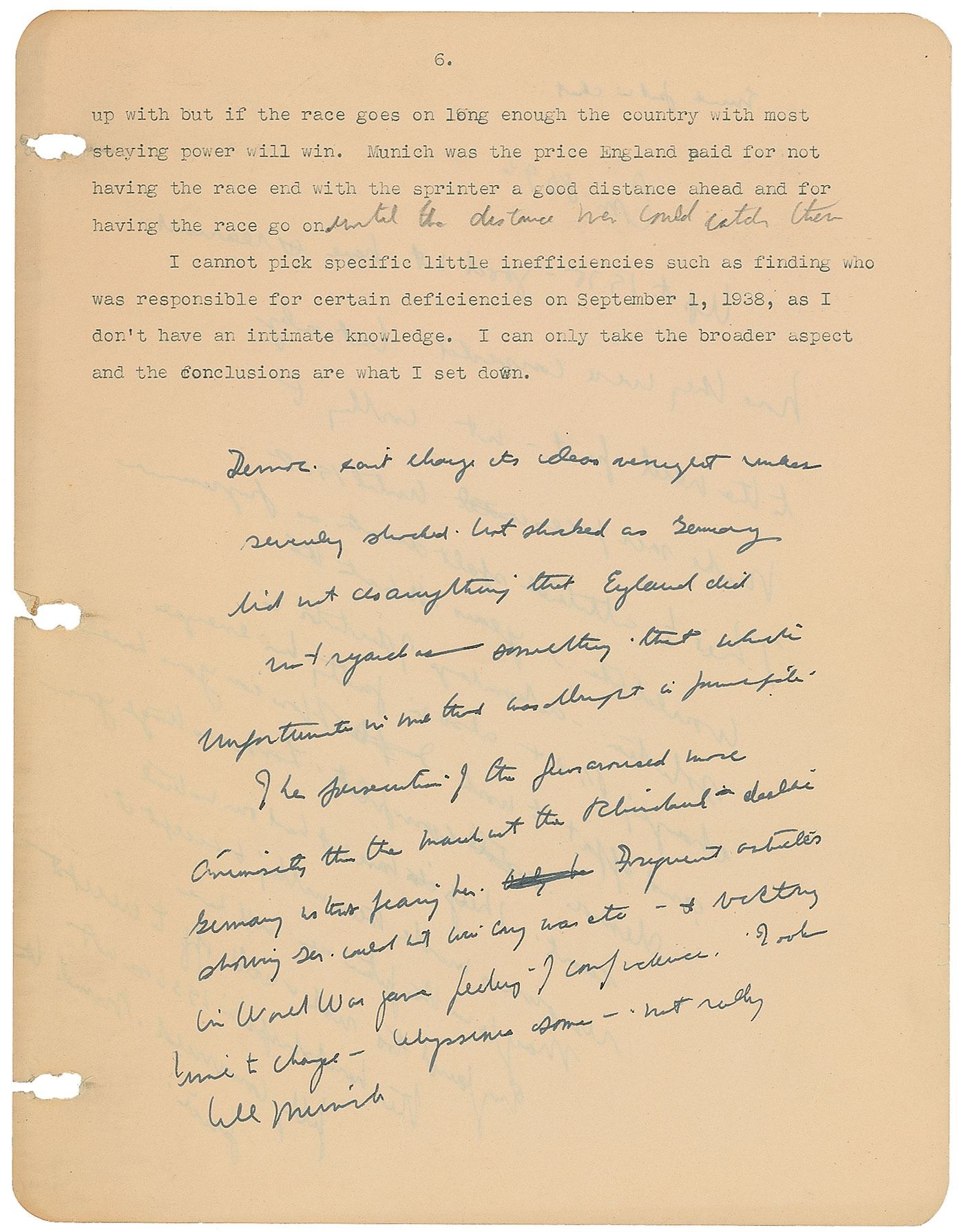 "Appeasement at Munich: The Inevitable Result Of The Slowness Of The British Democracy To A Rearmament Policy," 11 total pages including hand emendations in pencil and two lengthy handwritten pages in ink. This senior thesis became the foundation for JFK's first published book, "Why England Slept" in 1940 which examined the years leading up to World War II and the measures taken—or not taken—by England to thwart the German threat before it developed into World War II.