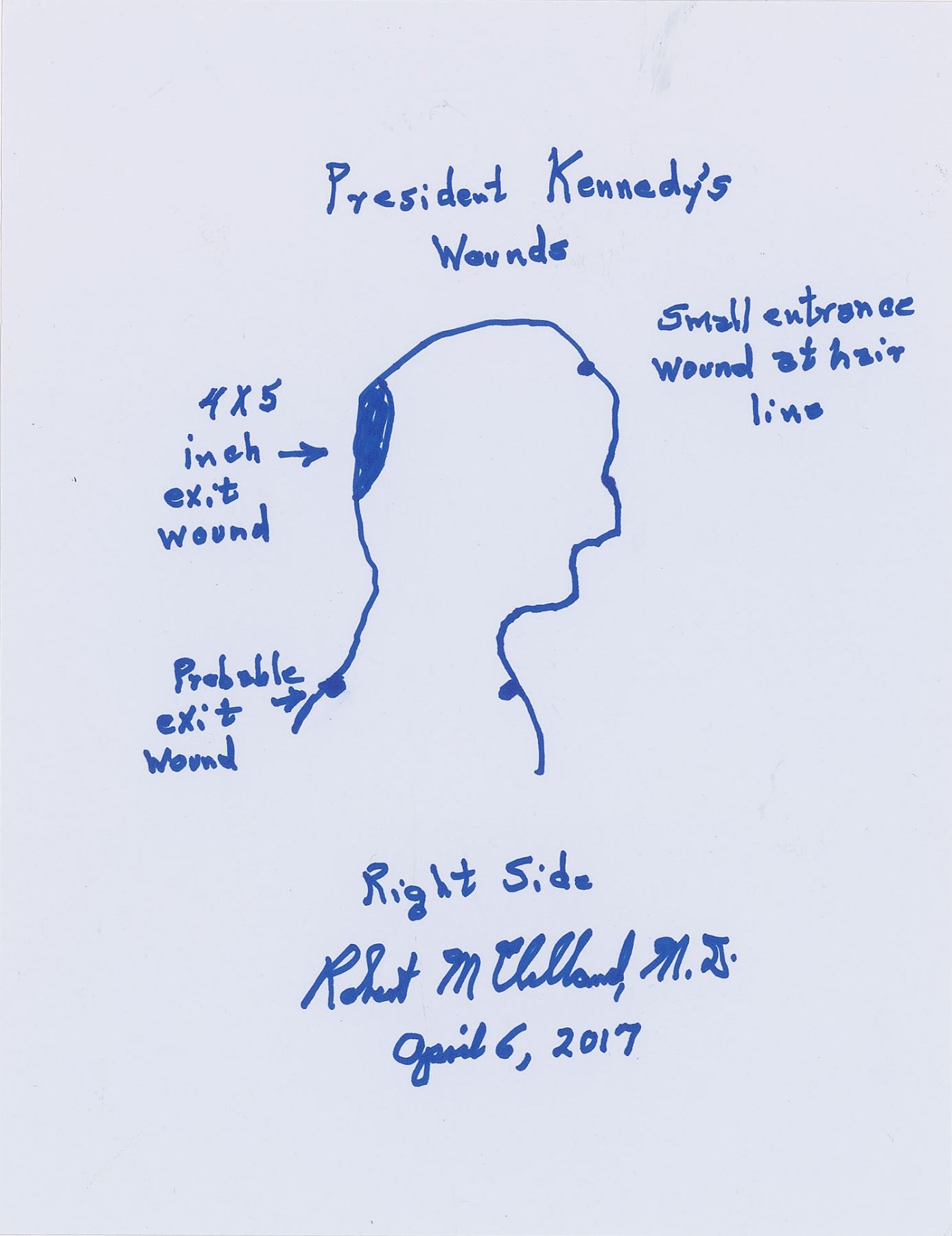 Surgeon at Parkland Hospital who attended to President Kennedy after he was shot on November 22, 1963. Original signed felt tip sketch of "President Kennedy's Wounds" on a white 8.5 x 11 cardstock sheet, signed "Robert McClelland, M.D., April 6, 2017." The sketch shows President Kennedy's head in profile, with the entry and exit wounds labeled on the head and neck. In very fine condition. This version of McClelland's sketch has the wounds coming from different directions, which was the subject of some discrepancy in his testimony before the Warren Commission; he initially characterized the wound at the front of the neck as an entrance wound, but backtracked on his ability to identify with certainty the exit and entrance wounds. However, he has always maintained that the mortal wound—the head wound—came from the front, likely fired from the 'Grassy Knoll' ahead of Kennedy's motorcade. McClelland maintains that there were at least two shooters and that the assassination was likely a conspiracy involving government elements.