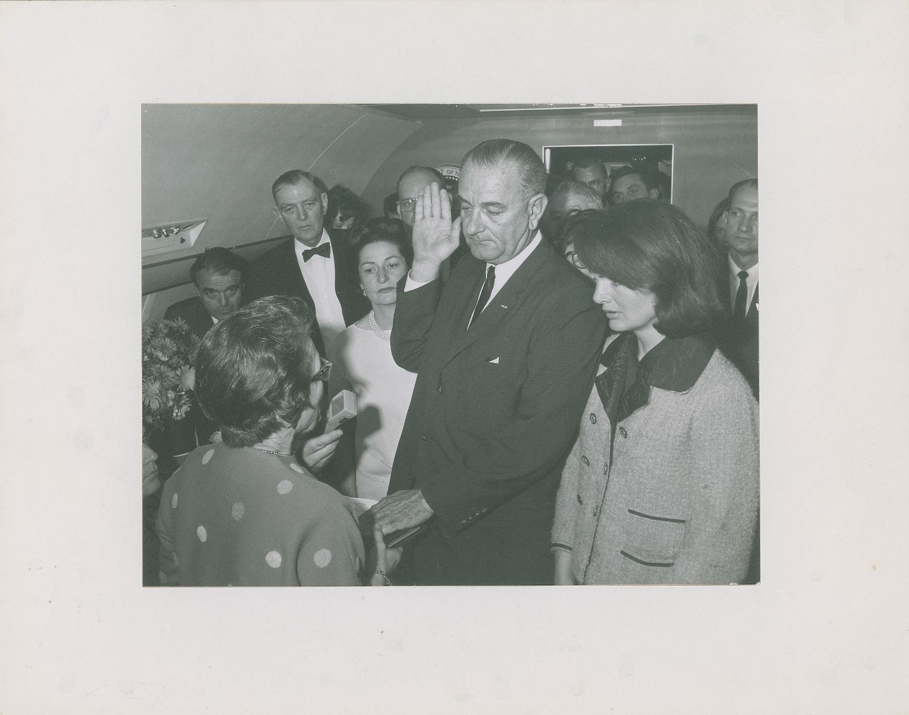 Original vintage matte-finish 9.5 x 7.25 photo of Lyndon B. Johnson taking the oath of office aboard Air Force One following the assassination of President John F. Kennedy on November 22, 1963, taken by official White House photographer Cecil W. Stoughton. The photo is affixed to the original 14 x 11 mount, which bears an official “Cecil Stoughton, The White House” stamp on the reverse. The most notable figures in the image are Judge Sarah T. Hughes, administering the oath in the lower left; the new first lady, Lady Bird Johnson; the new president, Lyndon B. Johnson, with his right hand raised during the swearing-in ceremony; and the mourning former first lady, Jacqueline Kennedy. In fine condition.