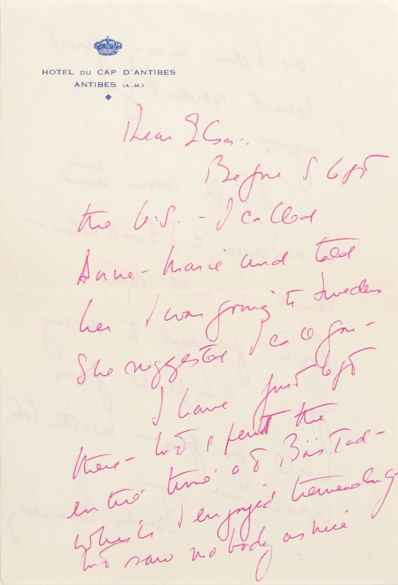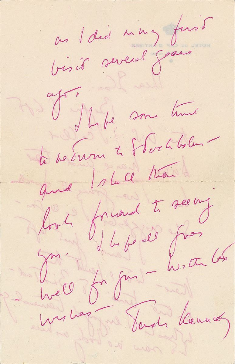 In 1948, Kennedy sparked a long-term liaison with Swedish flight attendant Anne-Marie Kinney, the best friend and co-worker of Elsa Fogelstrom. The 31-year-old Kennedy rendezvoused with Kinney the following year in Stockholm, and twice-visited Fogelstrom and her husband during his stay; the young congressman maintained contact with the couple over the next decade while nurturing his relationship with Kinney, who later moved to the US. During his 1955 trip to Sweden, Kennedy “spent the entire time at Bastad,” the hometown of Gunilla von Post, a Swedish aristocrat whom he had romanced two years prior, only weeks before his marriage to Jacqueline Bouvier. Additional research reveals that Kennedy wrote to von Post on the very same date as this missive, using both the same red ink and d’Antibes stationery, bringing further into light the secret and various profiles of JFK.