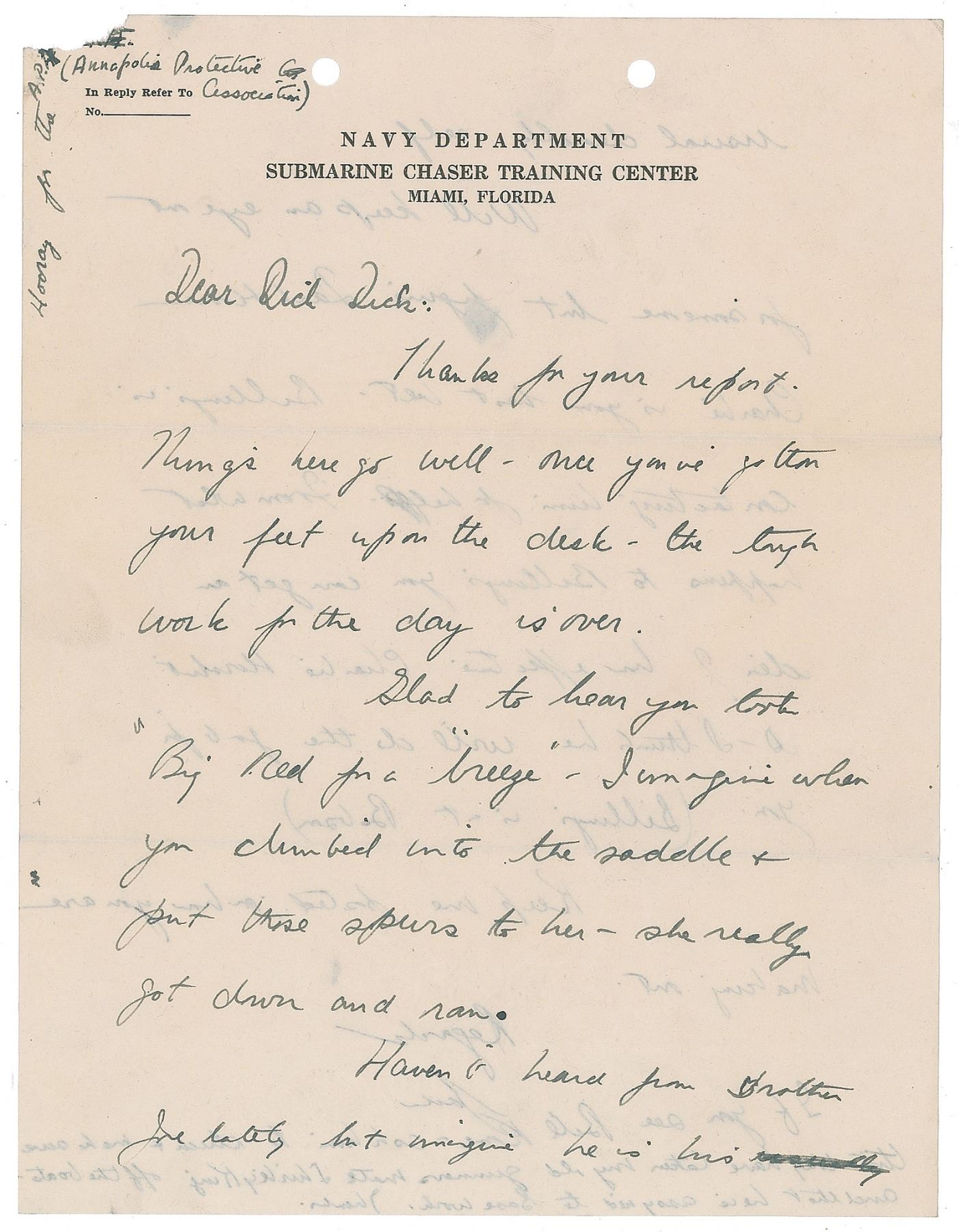 The discussion of “Big Red” likely alludes to PT Boat Red, a training boat used at the Motor Torpedo Boat Squadrons Training Center in Melville, Rhode Island. Veterans of training there called it ‘the Annapolis of the Mosquito Fleet’ in reference to the Naval Academy at Annapolis, Maryland. Kennedy’s addition of “Hooray for the A.P.A. (Annapolis Protective Association)” reflects the PT crews’ belief that they protected the larger ships commanded by graduates of the Naval Academy at Annapolis. A wonderful letter packed with references to Kennedy’s life and military career.